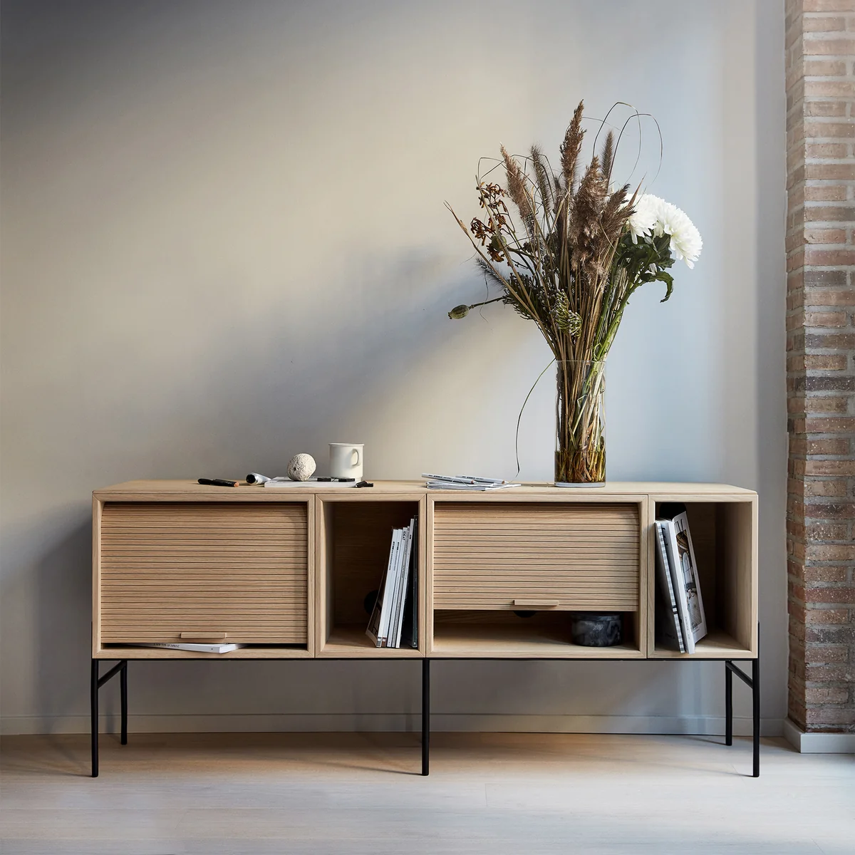 The Hifive cabinet with practical rolling doors not only looks good, but also hides unsightly HiFi equipment, receivers - if Hifive is used as a TV cabinet - or even files. The units are connected with a wooden panel on the surface and enthroned on a slender metal frame, which gives the sideboard elegance and lightness.