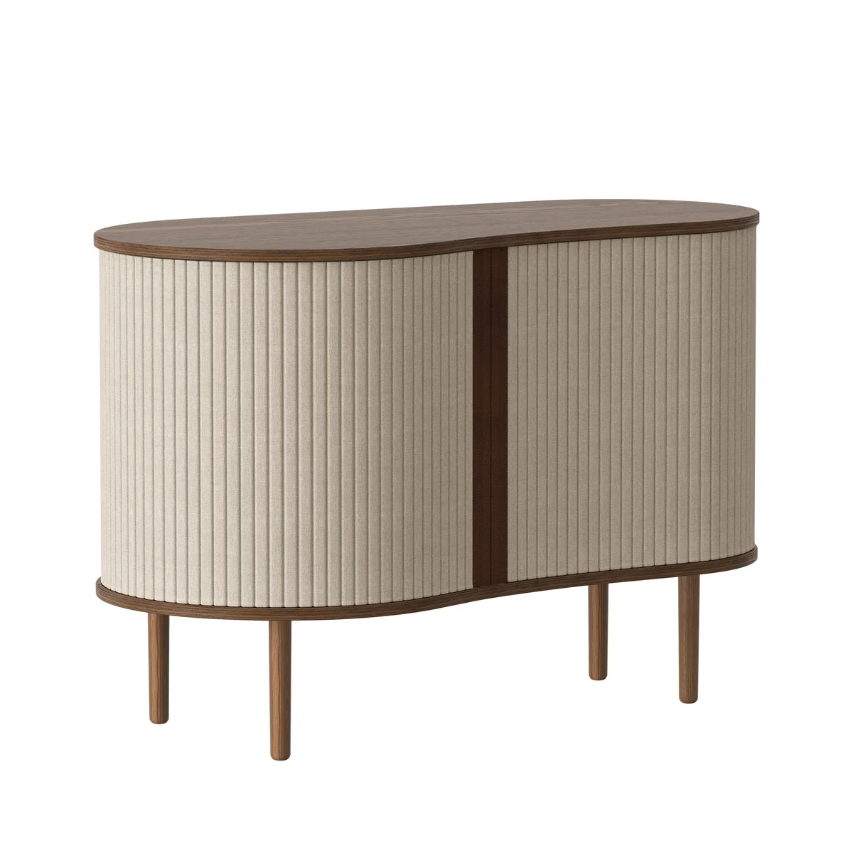 The harmonious corners of the chest of drawers designed by Jonas Søndergaard round off its profile, making it easy to fit in even in a room with limited space. The roller sliding doors have a textile cover, which Audacious gives a soft feel.