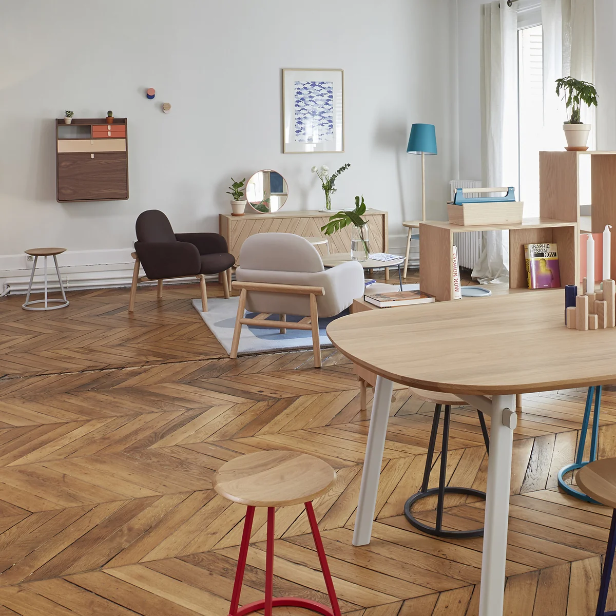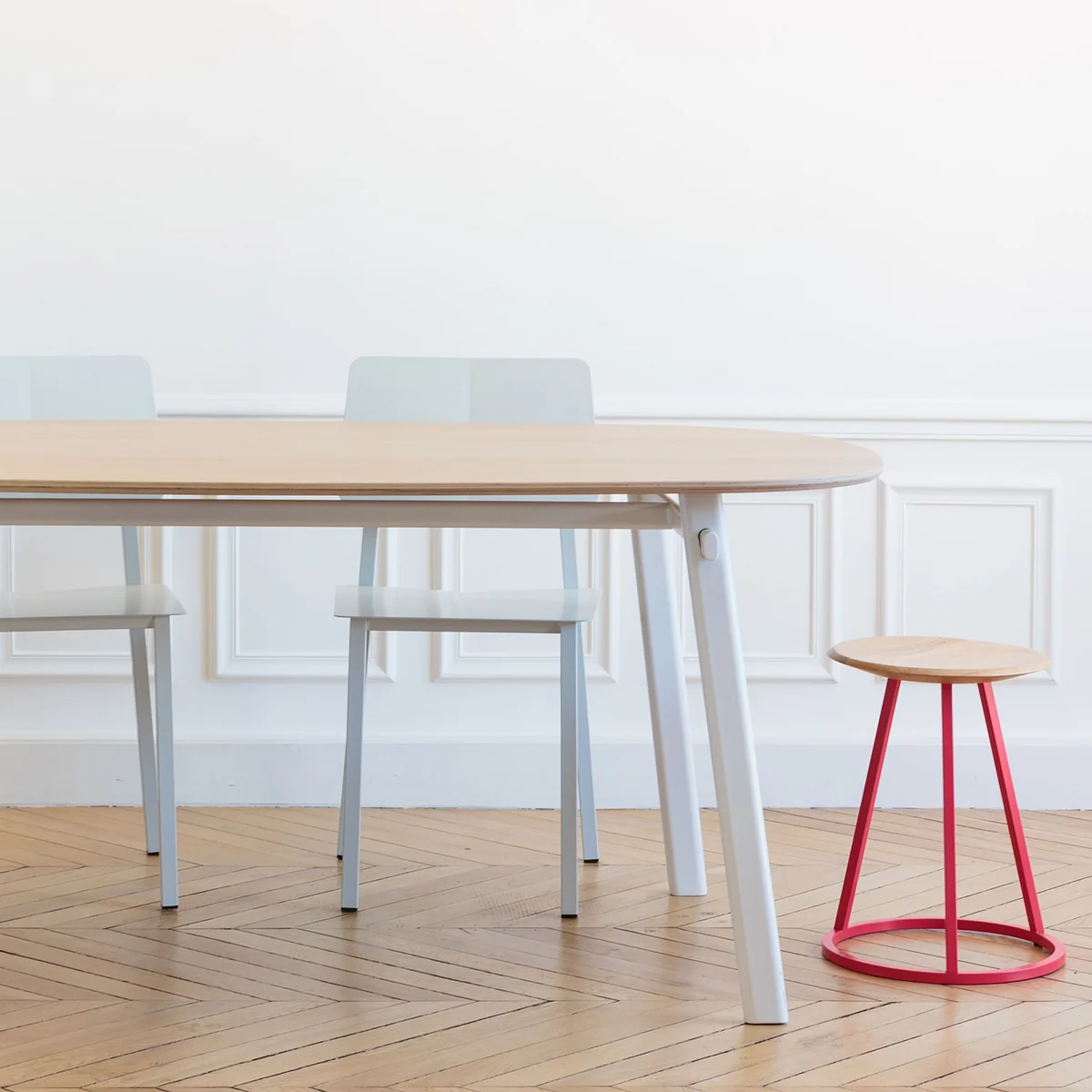 The Petit Gustave Stool by Charles Seuleusian for Hartô is an interesting stool that fits and complements any room situation thanks to the material combination of wood and matt lacquered metal in different colors.