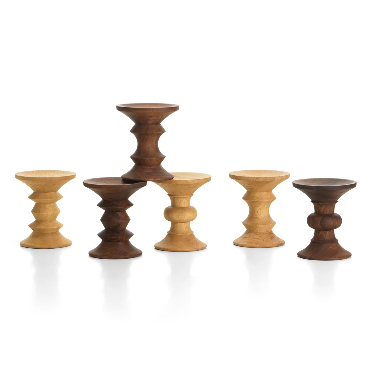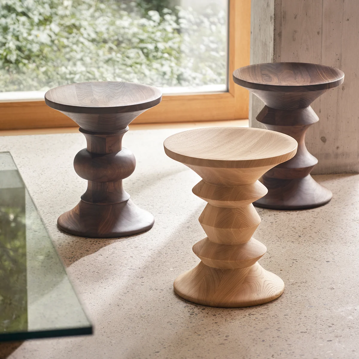 The turned stools can also be used as side tables if desired. The Eames stool was created in the year 1960. At that time, the Eames office was given the assignment of furnishing three lobbies in the Rockefeller Center in New York City by Time Inc. Aside from the whole interior work, comfortable lobby chairs and this series of solid walnut stools, produced by Vitra nowadays, were created in the scope of the project.