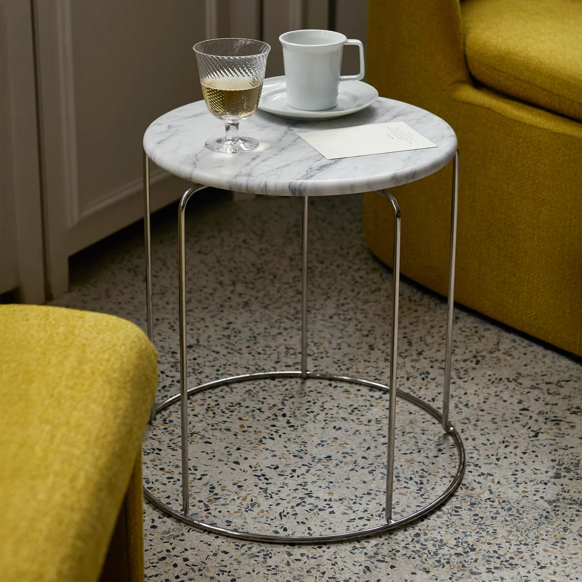 The VP11 table top from & Tradition complements the iconic Wire Stool by Verner Panton and transforms it into an elegant side table in the blink of an eye. Made of fine marble, the top rests securely on the concentric lines of the stool and lends the minimalist design a luxurious and tactilely exciting touch. The result is a versatile storage surface that is both functional and aesthetically pleasing - perfect for books, drinks or decorative accents.