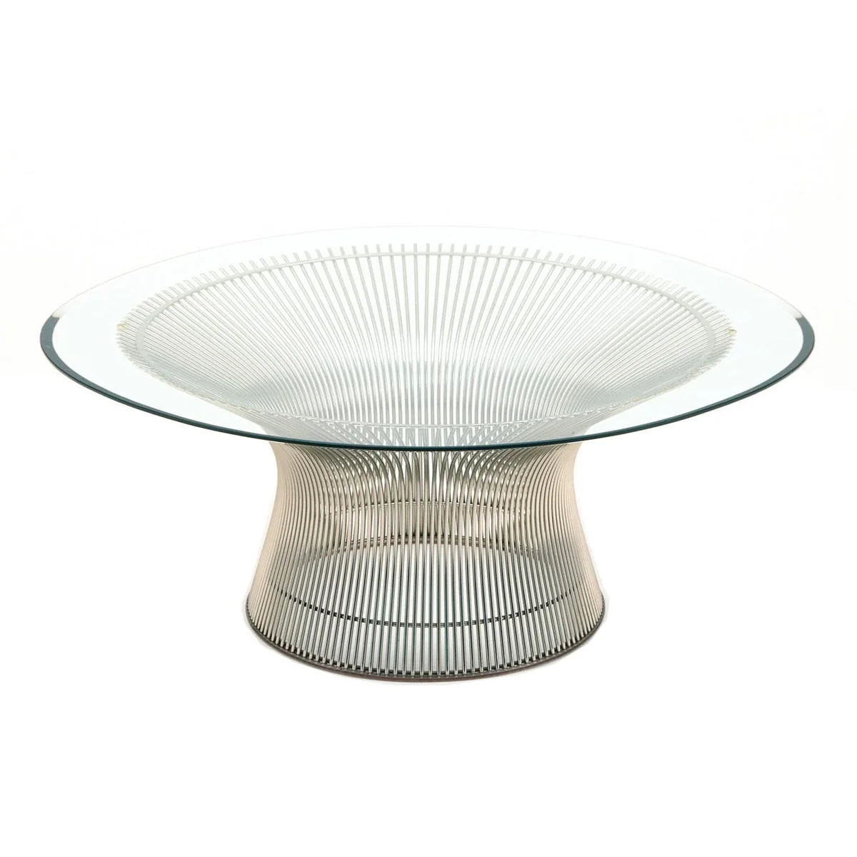 The Platner coffee table by Knoll, designed by Warren Platner, is an iconic design piece that impresses with its elegant combination of polished nickel and clear crystal glass. The round table symbolizes Platner's famous technique of artfully bending and welding steel rods to create a delicate, sculptural base that combines stability and lightness. The smooth glass top skillfully highlights the complex design and creates a fascinating interplay of light and shadow. A timeless statement piece for any room.