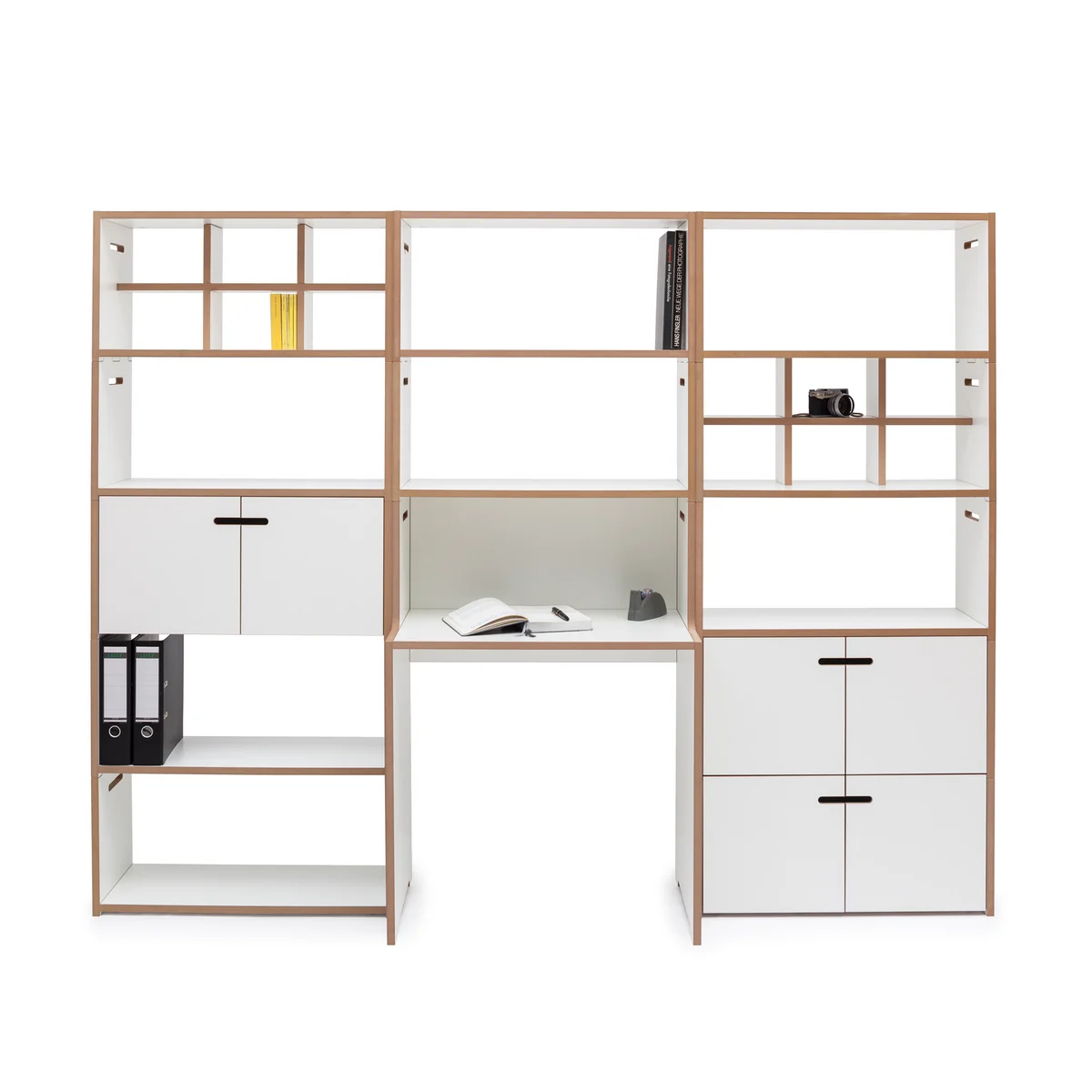 schreiben is the name of a small and compact Tojo desk designed by Dirk Frömchen. It fits perfectly into Tojo's high stacker shelving system and can be extended with a lid. The desk itself thus becomes a modular shelving system and, in addition to a shelf for the laptop for learning and working, also offers storage space for office utensils and books.