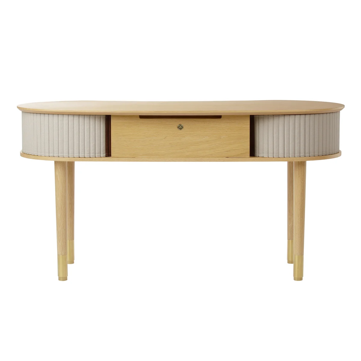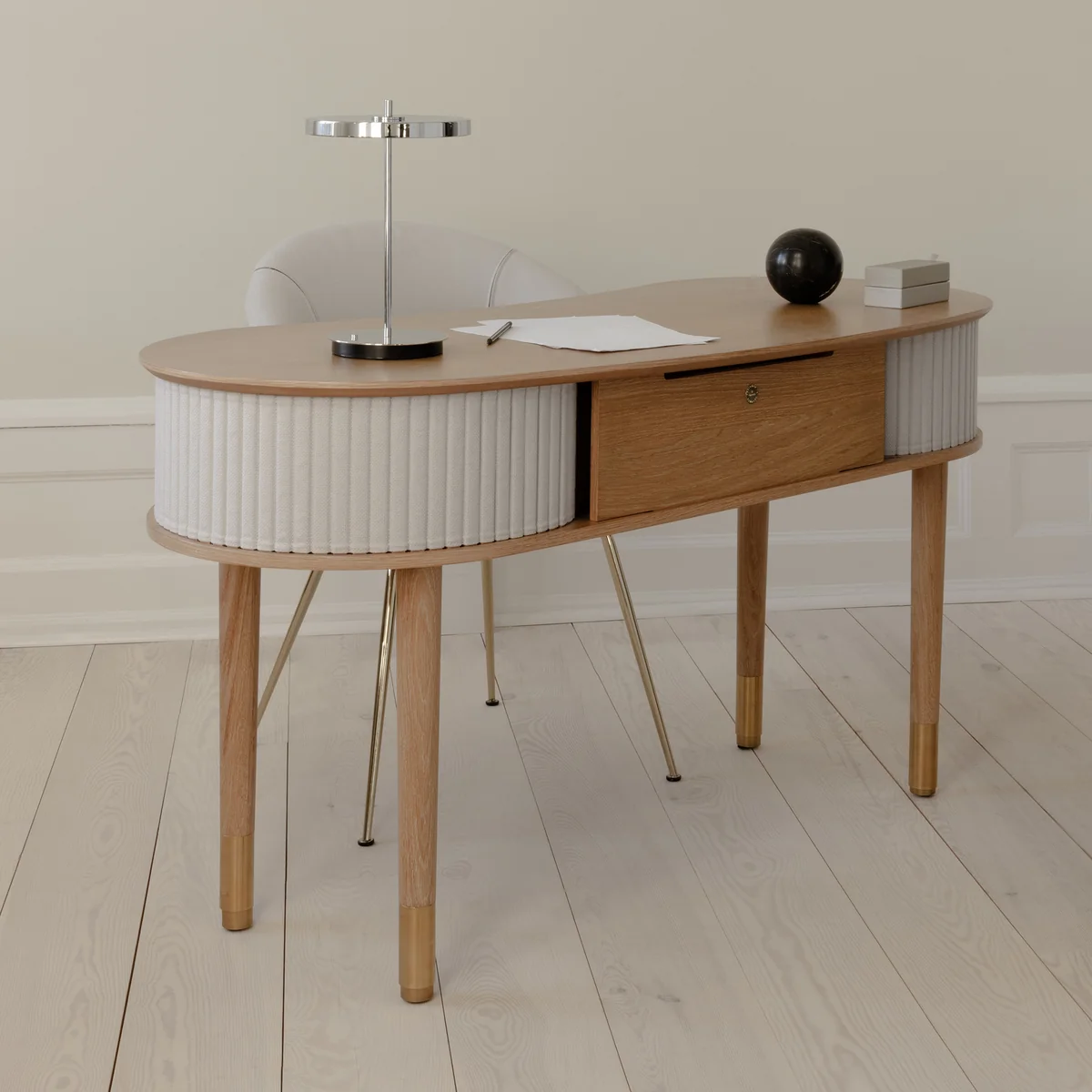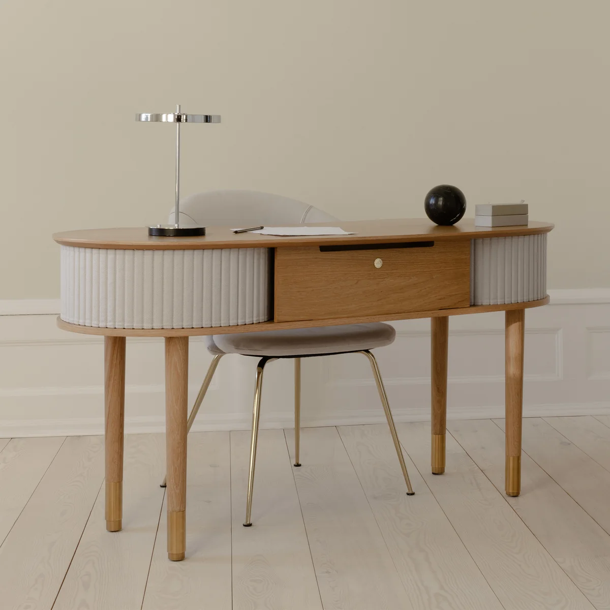 The Audacious desk from Umage embodies a harmonious interplay of functionality and aesthetic design. With its clean lines and minimalist approach, this desk fits seamlessly into any modern working environment. Its generous table top provides ample space for creative work and organized work. The integrated drawer provides additional storage space and helps to keep the work area tidy. Made from high-quality materials such as oak and steel, the desk not only impresses with its Audacious desk not only impresses with its visual elegance, but also with its durability and robustness. An inspiring piece of furniture for productive days at the desk.