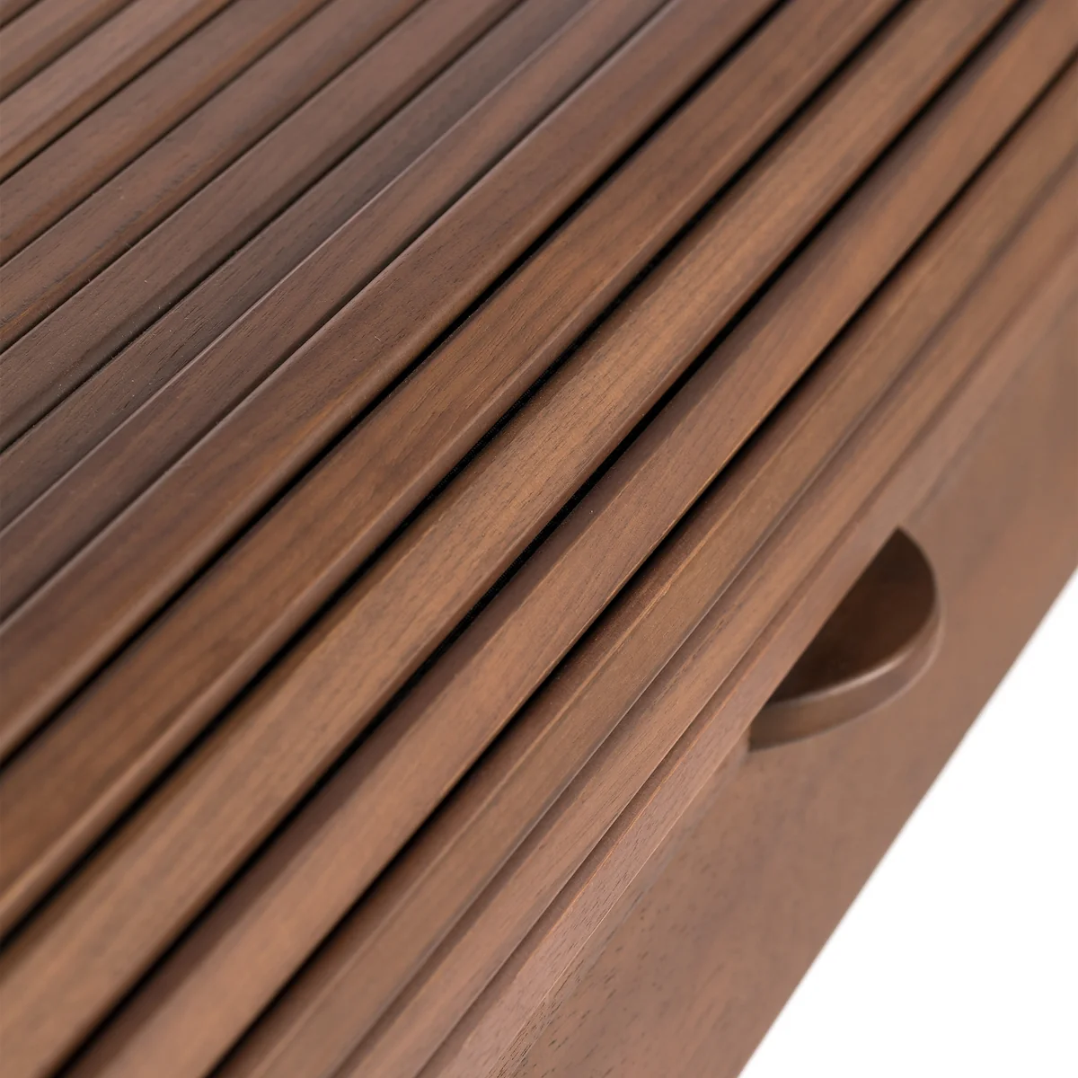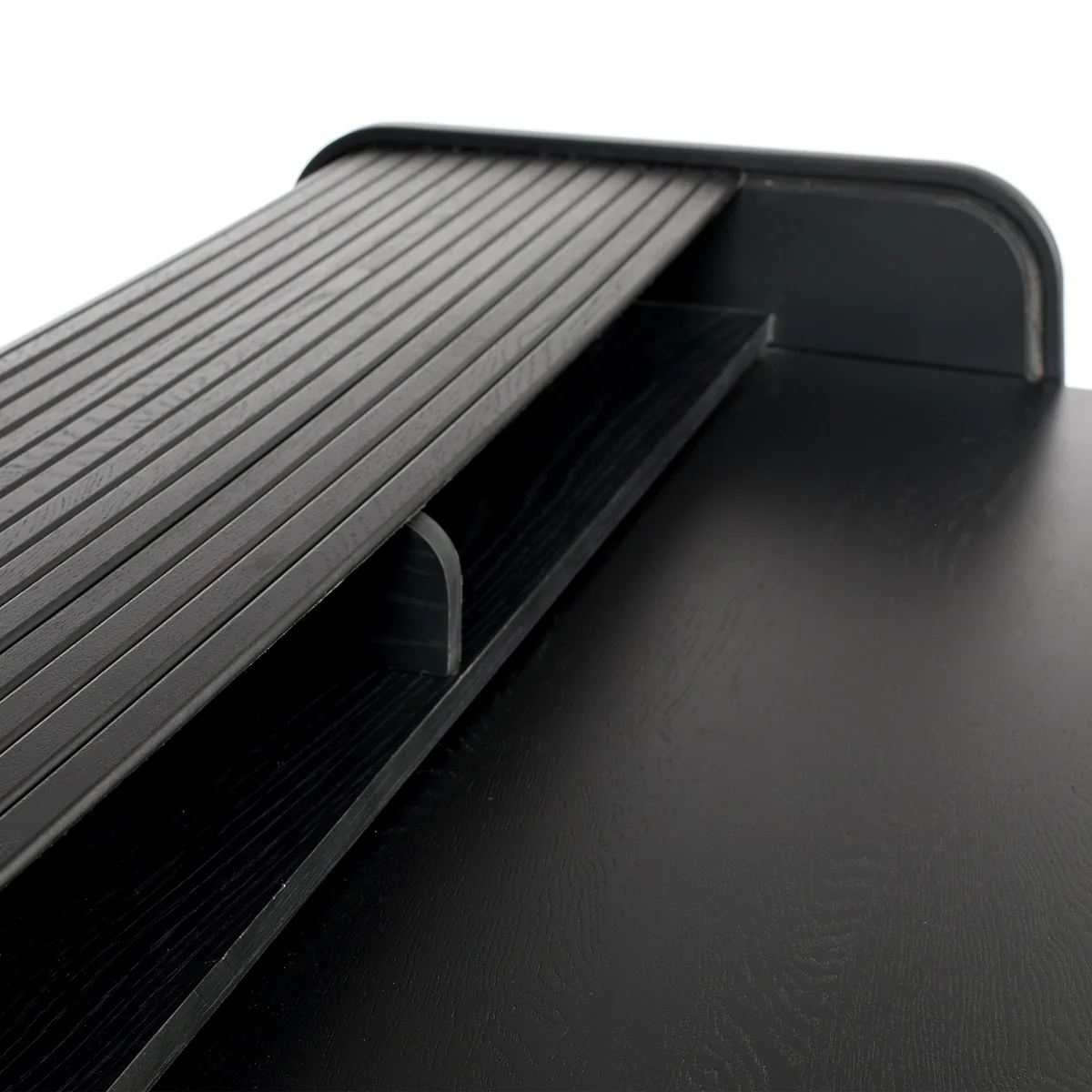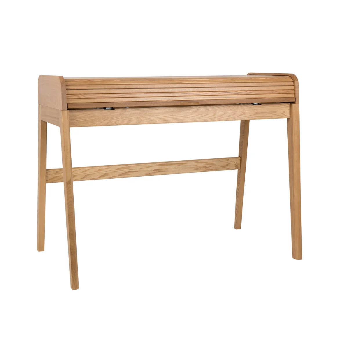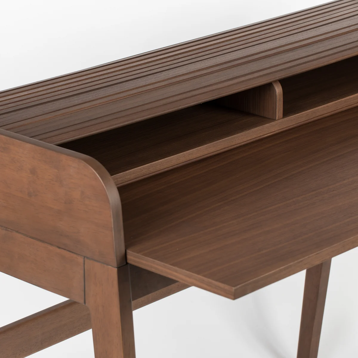 Made from high-quality real wood veneer with gently rounded edges and delicate, tapered legs, the desk lends any room a warm, inviting atmosphere. Barbier desk adds a warm, inviting touch to any room. The special design feature: a sliding cover with fine grooves that conceals a spacious inner compartment for cables, notebooks, tablets or other work utensils. This keeps the desk surface tidy at all times - ideal for focused work.