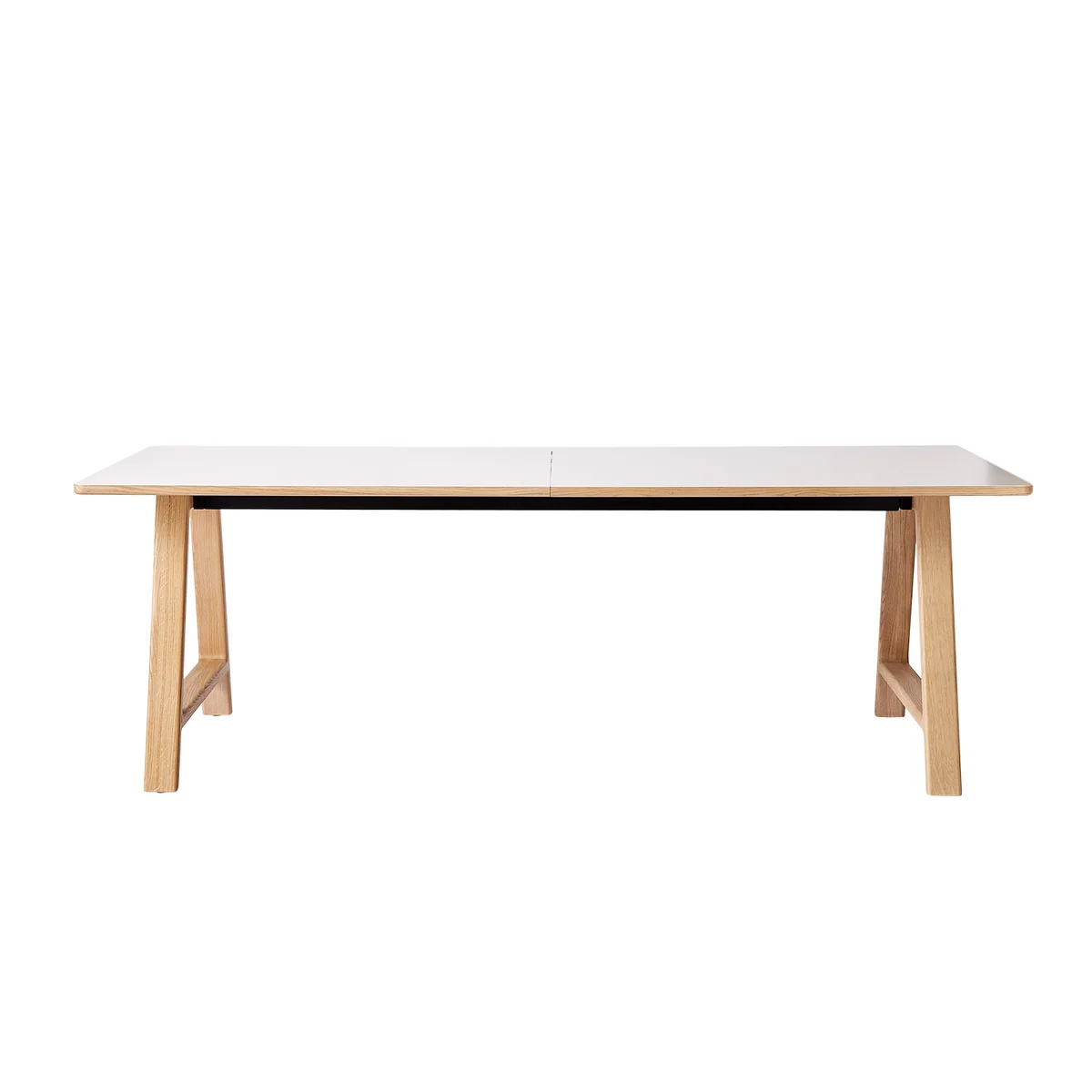 The rectangular extendable table, made from robust materials T11 is characterized by its durability and solidity. The table top, made from hard-wearing white Pfeiffer laminate, has a smooth surface that is complemented by a sophisticated solid oak edge. The base of the table, a classic in white pigmented oak, lends it not only lightness but also a natural warmth.