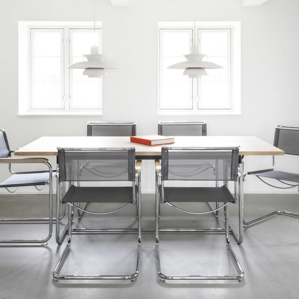 The S 1070 dining table from combines iconic design with high-quality craftsmanship. Its characteristic tubular steel frame ensures a delicate yet stable construction, while the fine wooden tabletop adds a warm, elegant touch. The clean lines and high-quality materials make this table a modern classic for dining areas, offices or conference rooms.