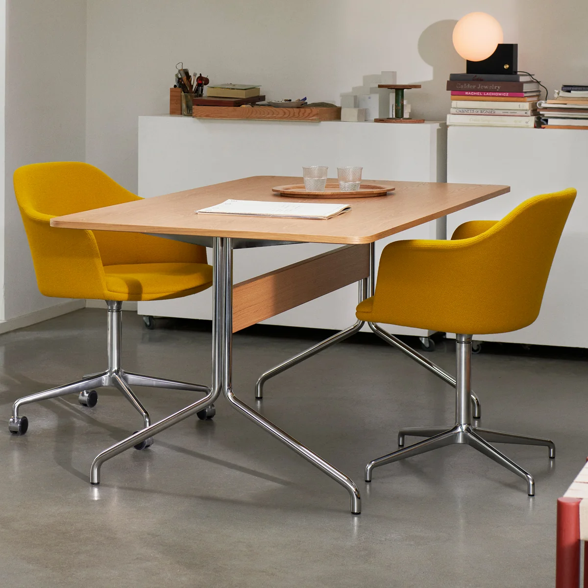 The Pavilion Dining dining table from the Danish house & Tradition can be used in many ways in the living area. Depending on the version, the table offers optimal space for the dearest guests. However, in addition to the classic variant in the living room, it can also be used in the study as a desk. Pavilion consists of a table top coated with lionoleum with veneered edges. The legs are made of bent steel tubes. The back of the table is made of molded veneer. Available in different sizes and wood variants.