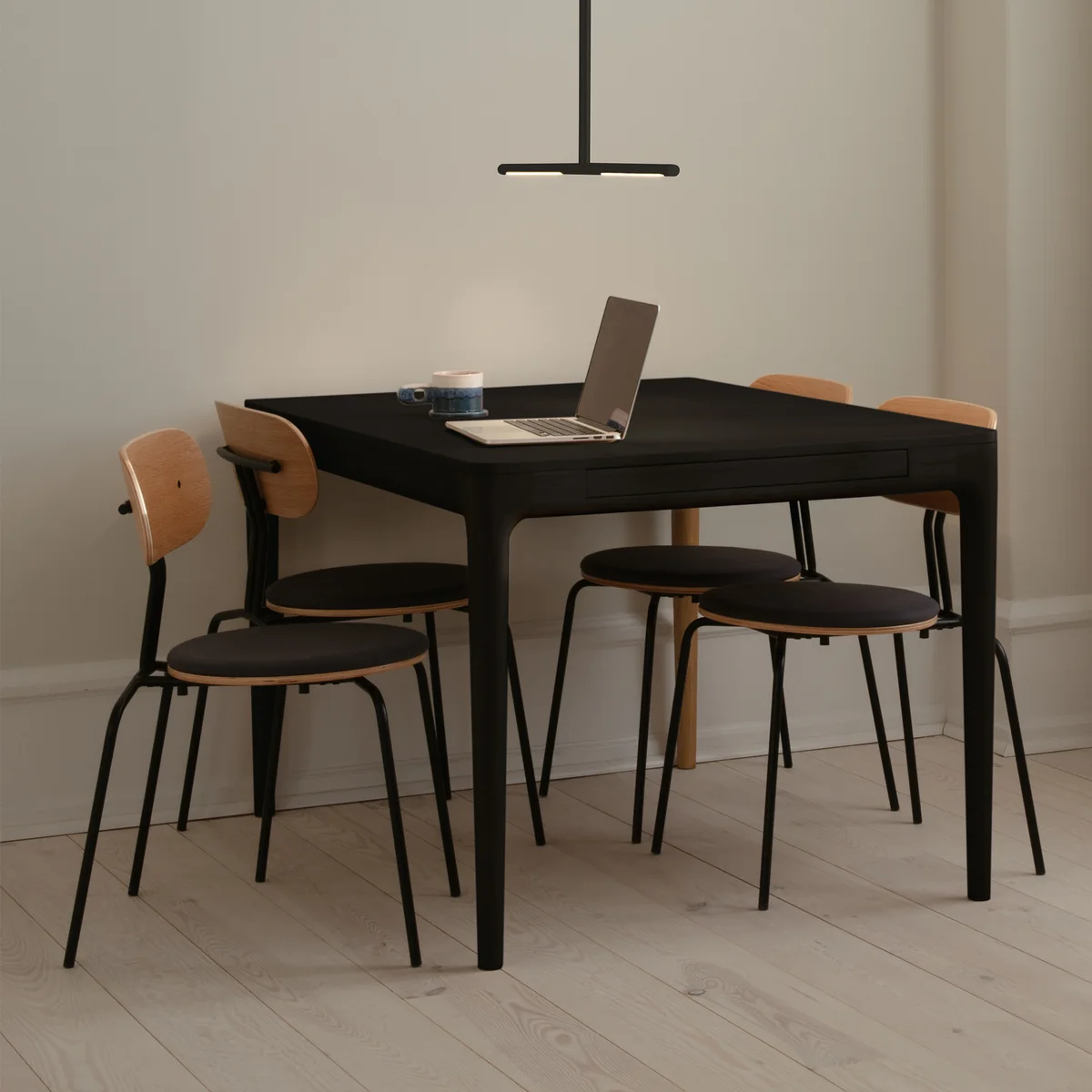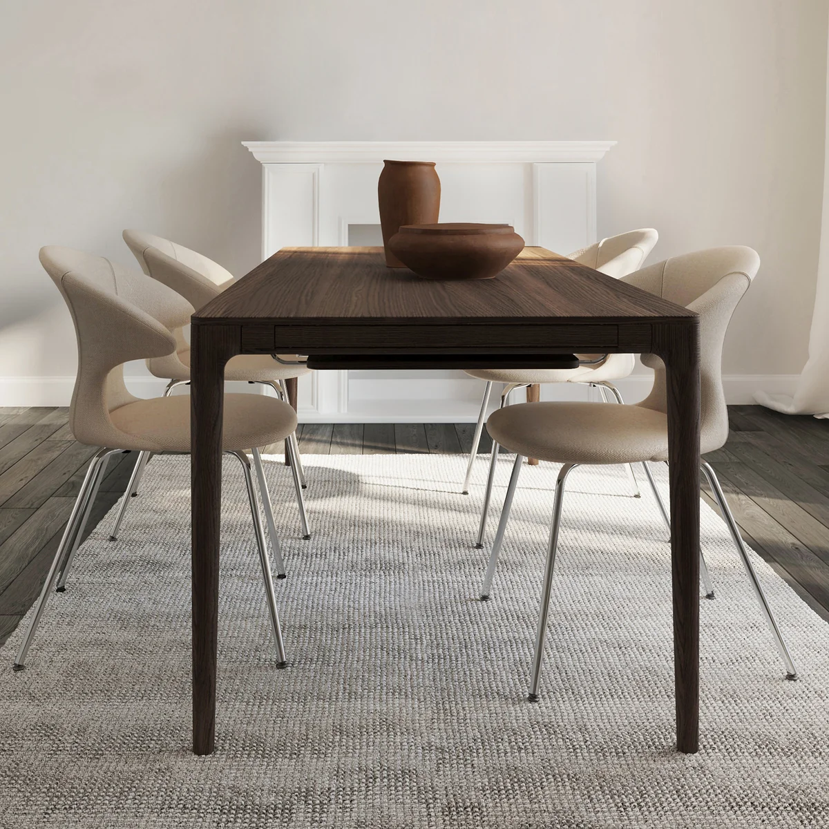 The Heart'n'Soul dining table from the manufacturer Umage is a minimalist fusion of form and function. The slim dining table can be extended and gives the dining room an extremely elegant look. Particularly practical: Heart'n'Soul The dining table has two fabric-covered drawers in which tablecloths and other items can be easily stored. The drawers also act as a holder for the dining table extension leaves. These shelves are hidden behind the table and can be easily attached and removed.