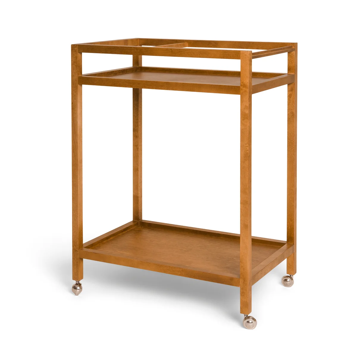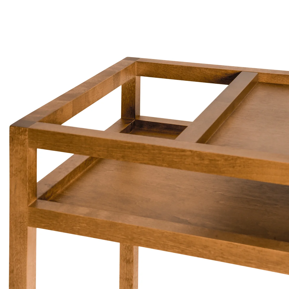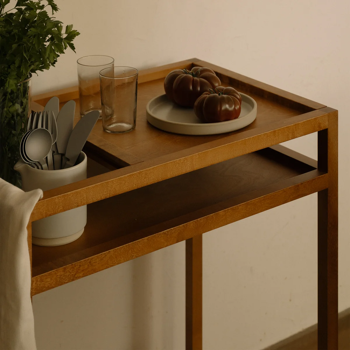 The Ratio trolley from Frama , designed by Ana Magalhães Ilharco and Matilde Cortez de Lobão (Ilo, 2024), reinterprets the classic bar trolley in a modern way. Made from MDF, birch veneer and solid birch in a warm brown tone, it combines natural materials with a clear, functional form. Thanks to the castors, the trolley can be moved effortlessly, while the removable tray offers additional flexibility in everyday life - whether as a serving trolley, mobile bar or stylish storage unit in the living room.