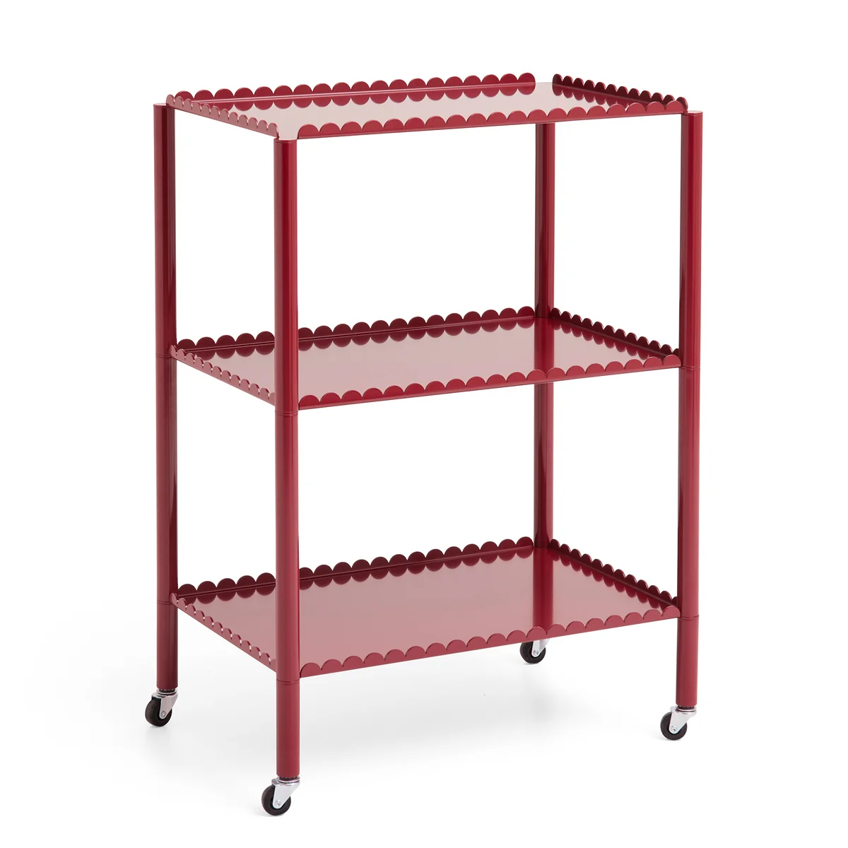 The Arcs Trolley designed by the Belgian duo Muller Van Severen for HAY is a functional and decorative trolley decorated with a uniform chain of vertical arches. The trolley integrates an extremely sculptural expression combined with industrial techniques. The elegantly curved frame supports two or three tiers - depending on the version. On the slender legs are mounted casters that facilitate the maneuvering of the trolley.