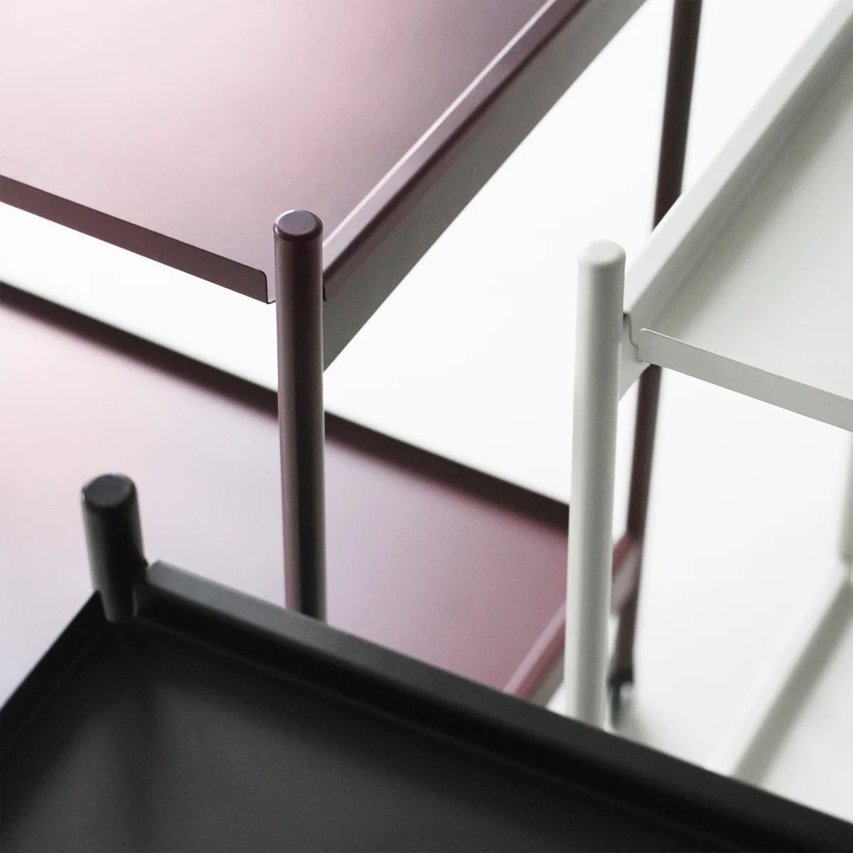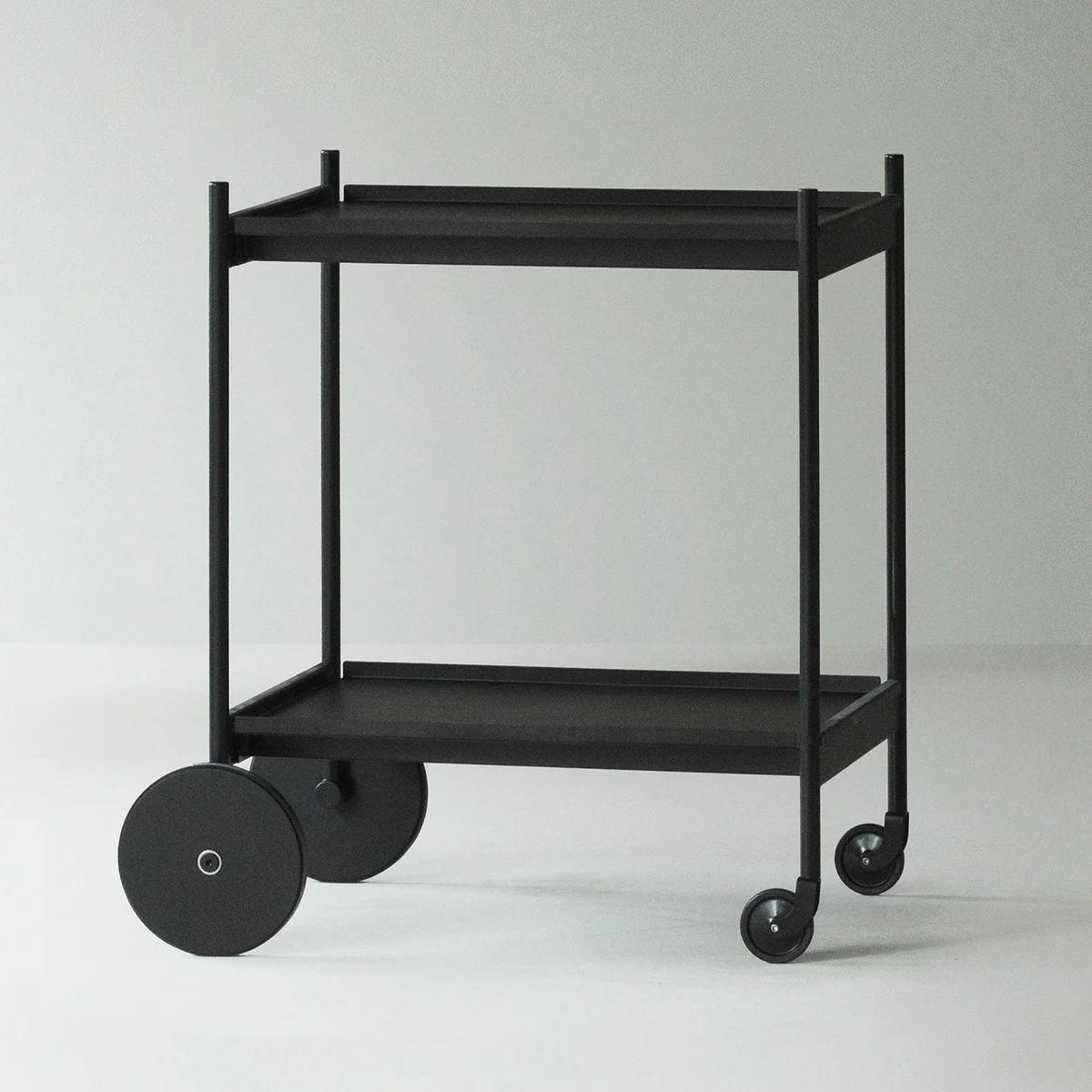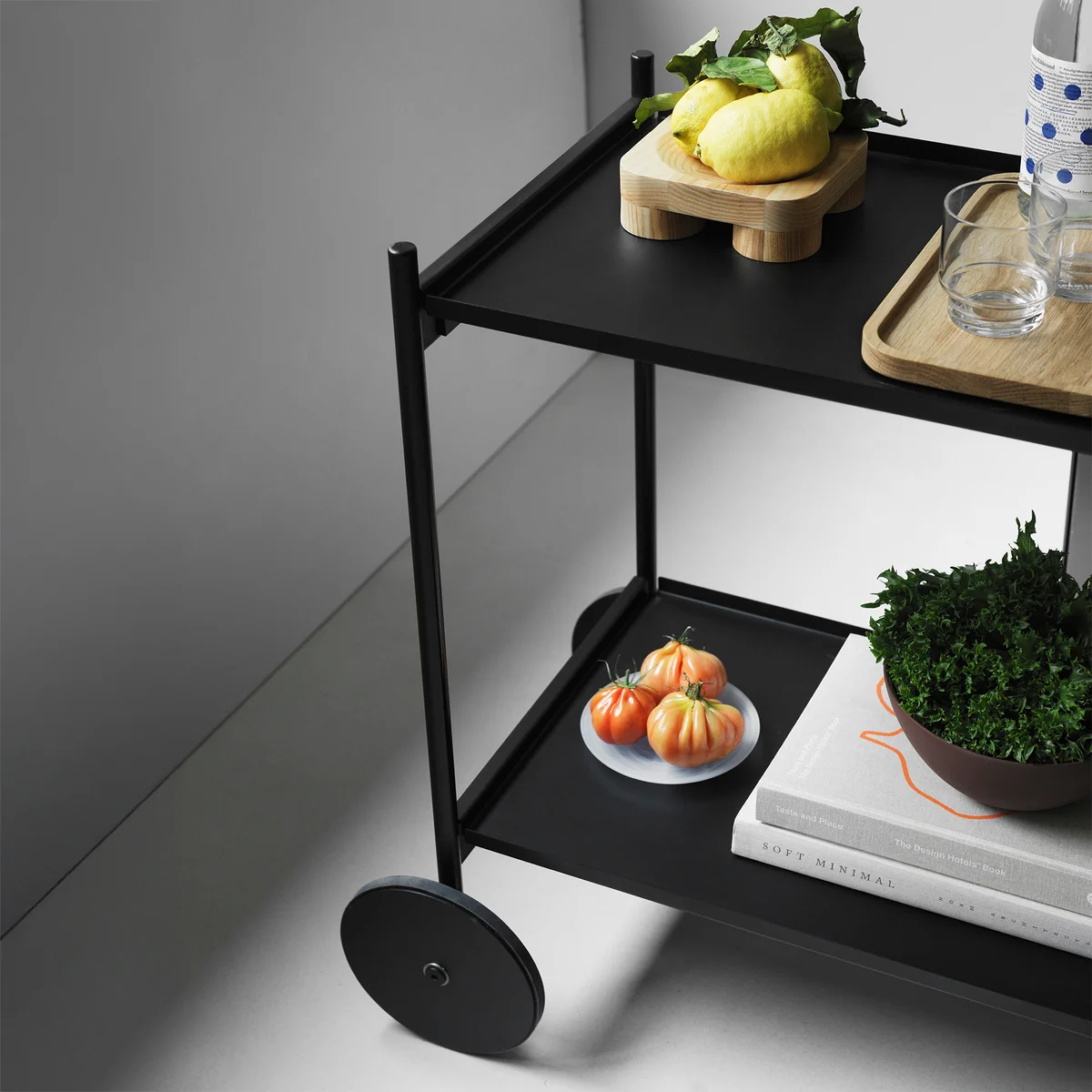 The Rul trolley impresses with its sleek, minimalist design and is made of durable, powder-coated steel. Its filigree construction gives it an elegant silhouette, while four wheels ensure optimal handling - two smaller ones allow 360° movement, while two larger ones provide additional stability. Thanks to two removable trays, the trolley can be easily adapted to different everyday needs and offers a practical solution for serving and storage.