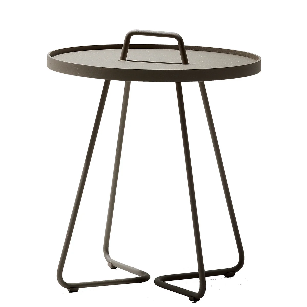 The small side table with a round storage surface is equipped with a practical handle. It allows the table to be carried flexibly and easily. This means it can easily be placed wherever it is needed. The table top and handle can also be removed and used as a practical tray.
