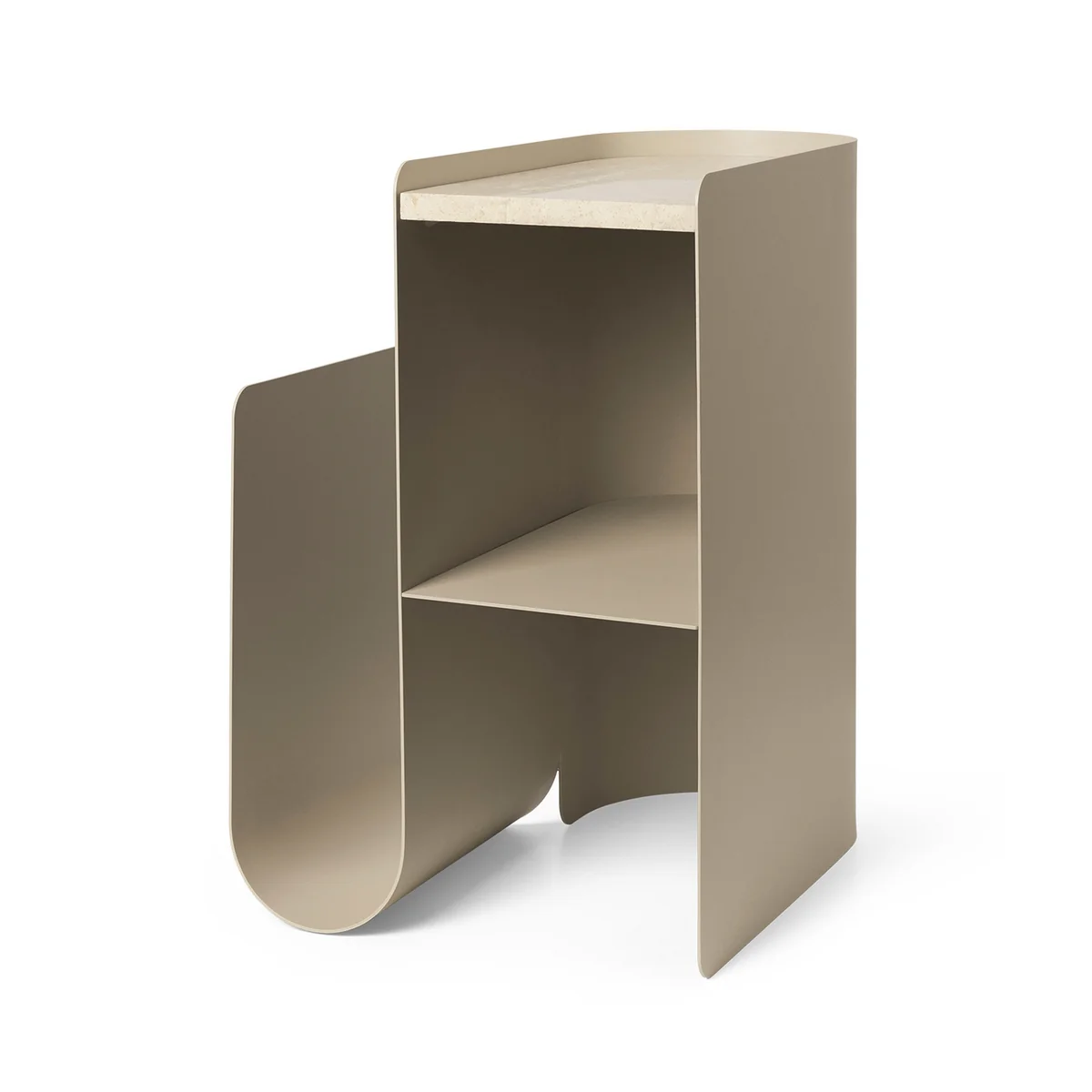 Enhance your space with this elegant and functional side table. Vault side table. The name of the table reflects the curved shape of the powder-coated steel frame. You can store your favorite books or magazines in the curved side, while the practical shelf is ideal for displaying decorative items. The tabletop itself is made of beautiful, natural marble, which gives the Vault Side Table a warm, refined expression.