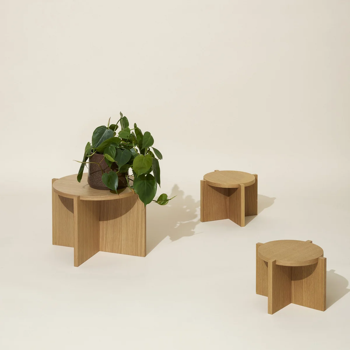 The Nomad Side table from the house Hübsch Interior inspires with its modern character and its unusual fanned out legs. Nomad Is made of a material mix of FSC®-certified MDF and oak veneer. The round, minimalist small side table makes a great figure not only in the bedroom as a bedside table, but can be placed just as wonderfully in the living room next to the favorite armchair or sofa. Books, magazines, remote controls and Co. find optimal storage space. However, it can be used equally well as a shelf for plant pots. Nomad is available in the dimensions Ø 45 x H 30 cm.
