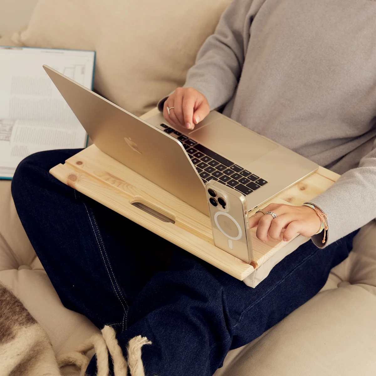 A new best friend for relaxing hours! Whether on the couch, in bed or in an armchair, this multifunctional table provides optimum support and relief when working. The tabletop offers space for your laptop, while the integrated stand groove holds your smartphone or tablet securely in the perfect reading and operating position. The soft cushion, filled with EPS beads, adapts flexibly to your sitting position for maximum comfort. BFF combines simplicity and functionality in a timeless design, so you can take your entertainment or work with you wherever you go.
