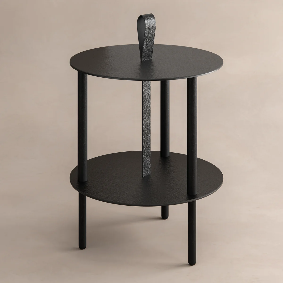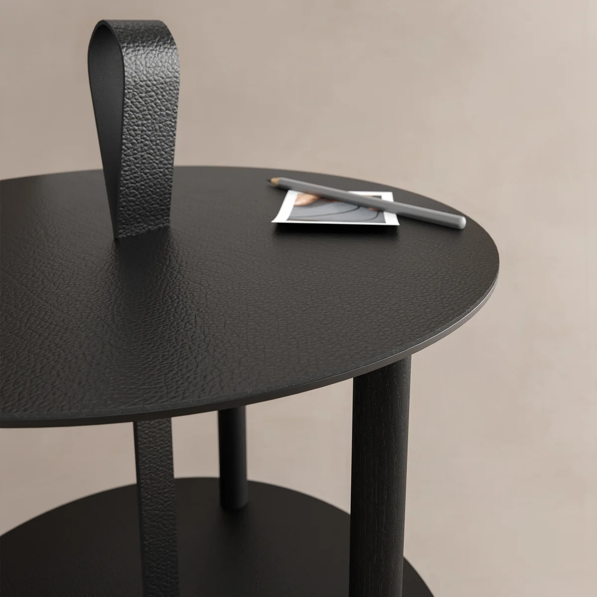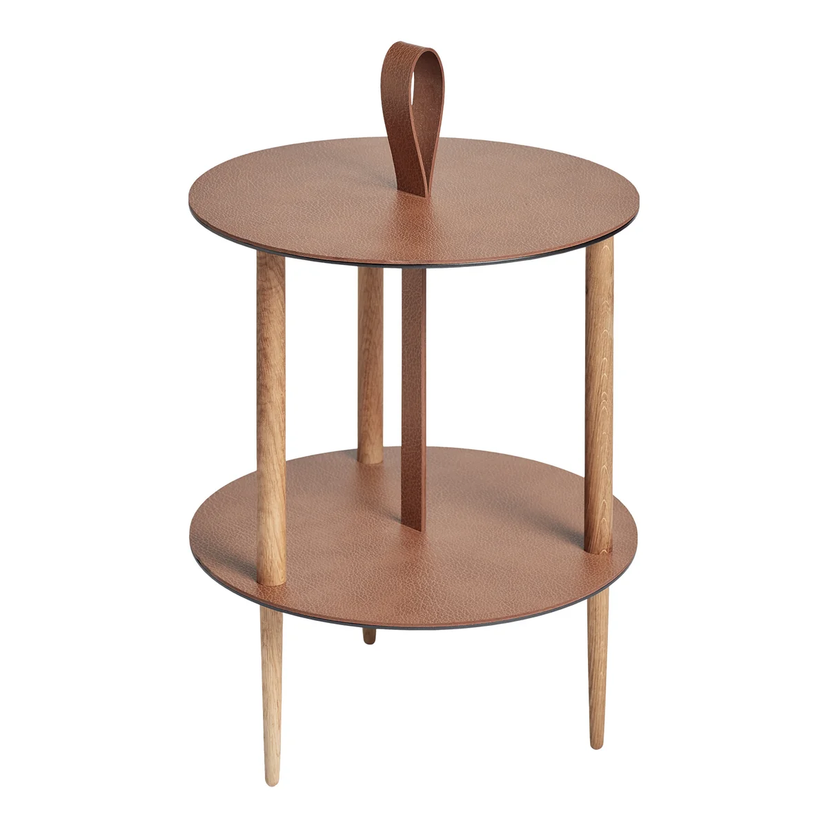 The side table consists of three oak wood rods and two round shelves with a diameter of 38 cm made of aluminium. Books, tin, reading glasses, glasses and much more find a stylish place on the surfaces. The surfaces are covered with recycled leather and the loop made of recycled leather is particularly practical.