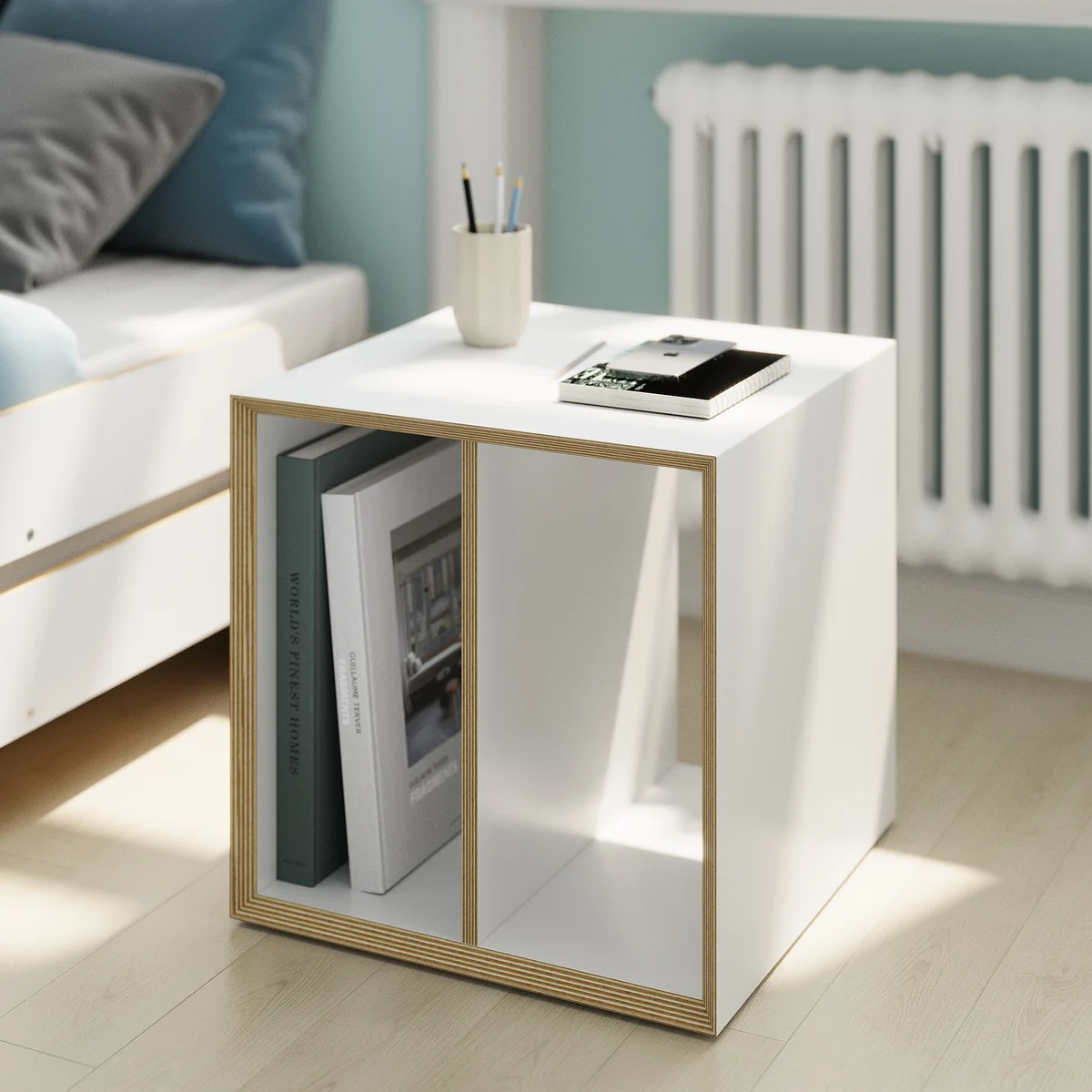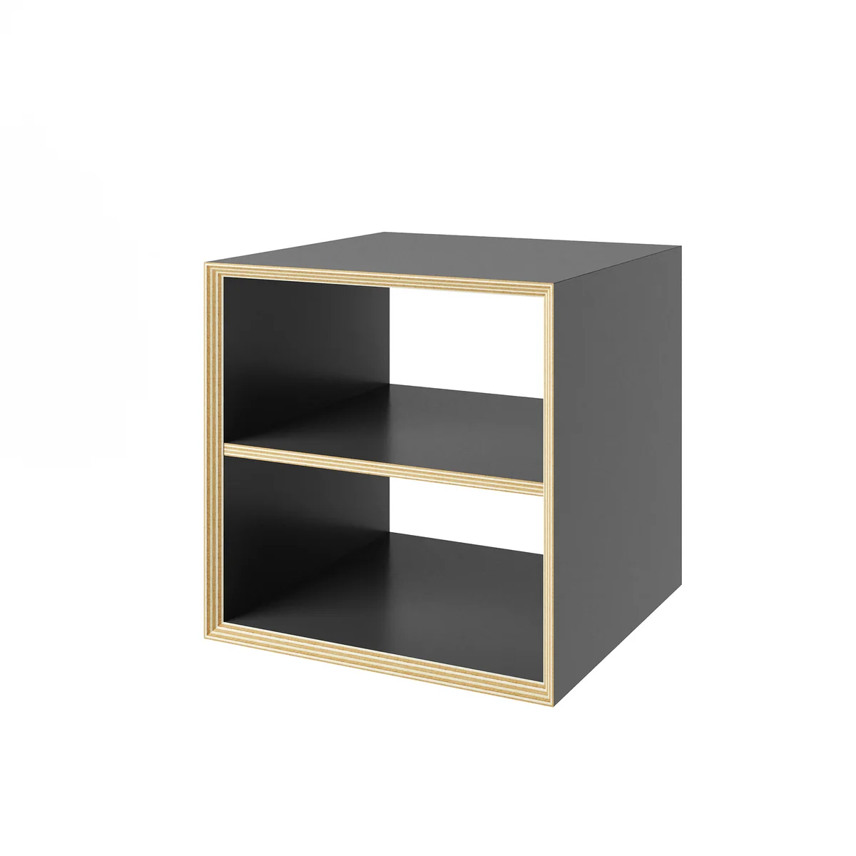 The Vertiko Dice is a versatile, rotating cube that offers maximum flexibility. With its compact dimensions of 45 x 45 x 45 cm, the module is suitable as a coffee table, side table, chest of drawers, stool or bedside table. The permanently integrated intermediate shelf divides the storage surface practically, depending on whether the cube is used horizontally or vertically. Vertiko Dice can stand alone or be combined into groups and is available in black, white or anthracite. Felt glides protect the floor and are included.