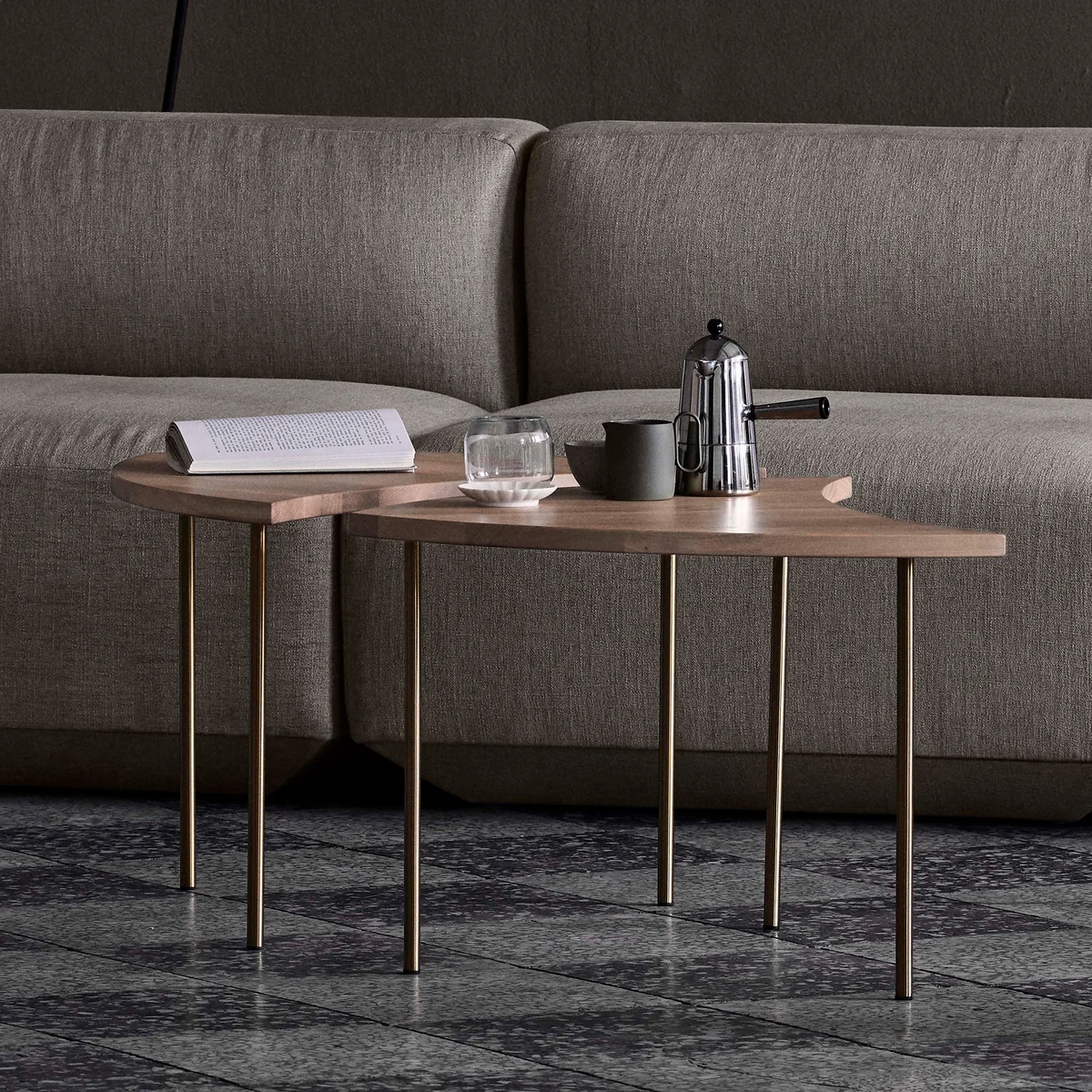 The table is available in oak or walnut, with polished stainless steel or brass legs.