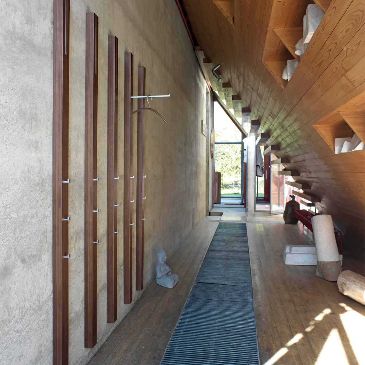 At the head end Line has a folding hook that protrudes up to 26.5 centimeters from the coat rack. However, Line is flexible here: the angle of inclination can be adjusted from the back with an adjusting screw. Thus, the coat rack can directly accommodate jackets, but also (if the folding hook is at right angles to the coat rack) can be hung with coat hooks and thus indirectly accommodate even more capacity. Whether solo or in a group next to each other - Line stows her clothes stylishly and safely.