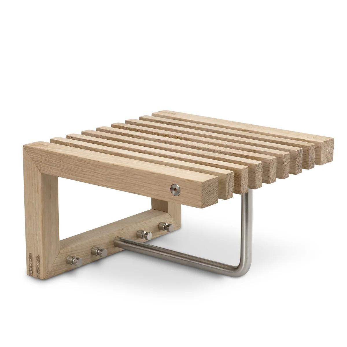 The neat simplicity of the Cutter -series also proved ideal for the hallway, bathroom and kitchen - in fact, for all rooms in the home. That's why it was expanded to include classic indoor products. The Cutter Minigarderobe is made of either teak or oak. The rod of the Cutter Coat rack is made of stainless steel, which adds a modern contrast to the classic wood look.