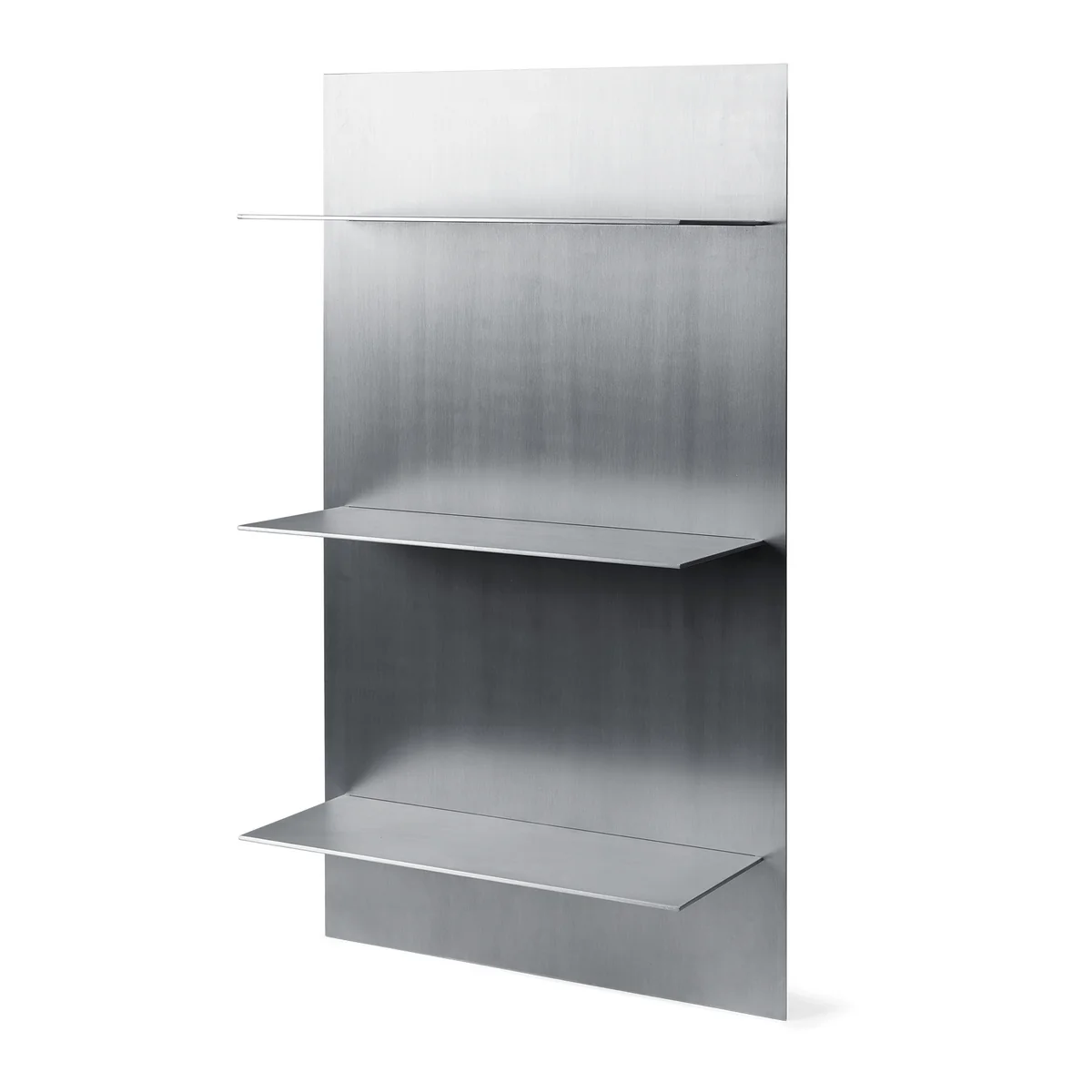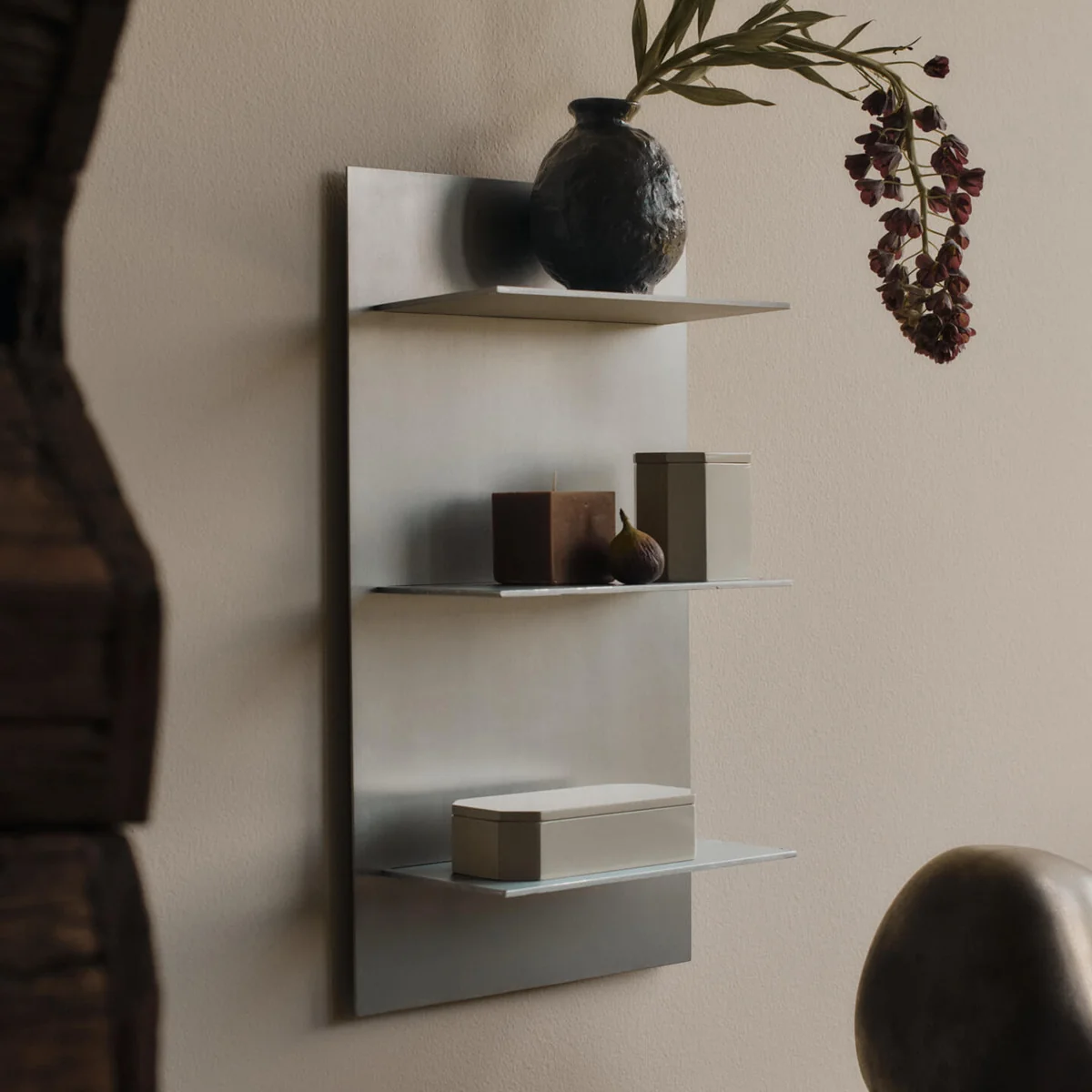 The Lager Triple wall shelf from Ferm Living is made of aluminum and picks up on industrial and brutalist aesthetics. It offers sleek, functional storage space for any room. The design allows for easy wall mounting using a French hanging system, and the even spacing between sections allows for multiple shelves to be stacked, perfect for a cohesive and tall library display.