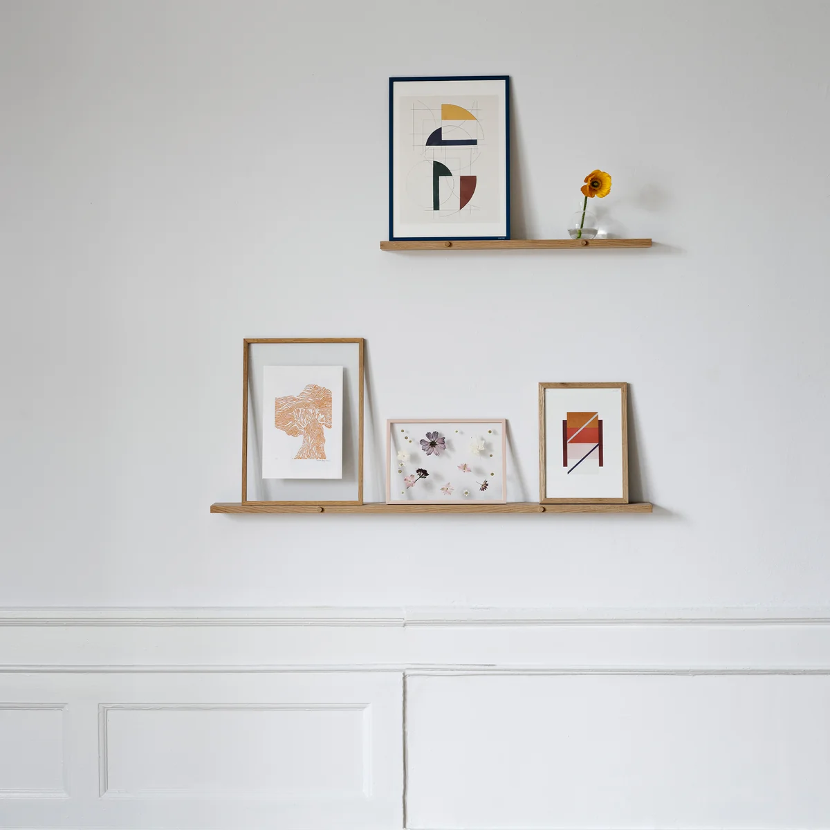 The Gallery Shelf from Moebe impresses with its simplicity. Made from solid oak, the wall shelf offers plenty of space for picture frames and posters thanks to its front groove. The free, smooth surface at the back of the shelf can be used wonderfully for books, vases and other decorative elements. This Gallery Shelf can be arranged individually or in combination with other wall ornaments to create - as the name suggests - a gallery wall of photos and posters in the living room or children's room.