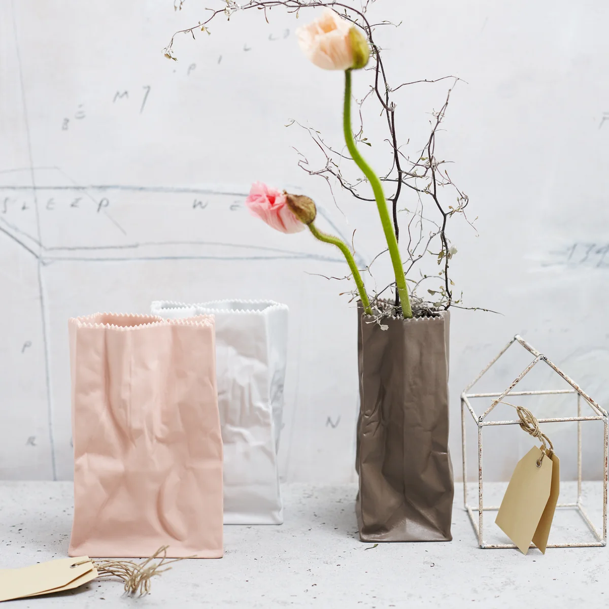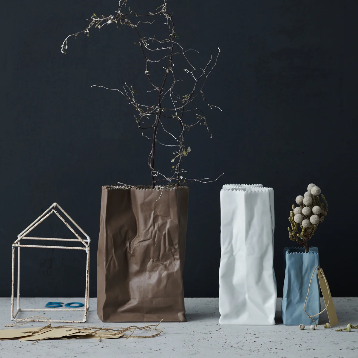 The original bag vase by the designer Tapio Wirkkala for Rosenthal is one of the most popular designs of the traditional porcelain company and is part of the "Do not litter" Collection. The collection contains everyday items and disposable objects such as paper bags, cans and milk boxes re-interpreted with high-quality materials.