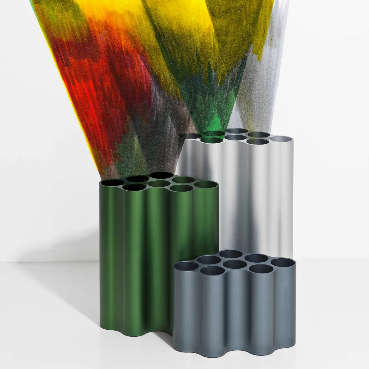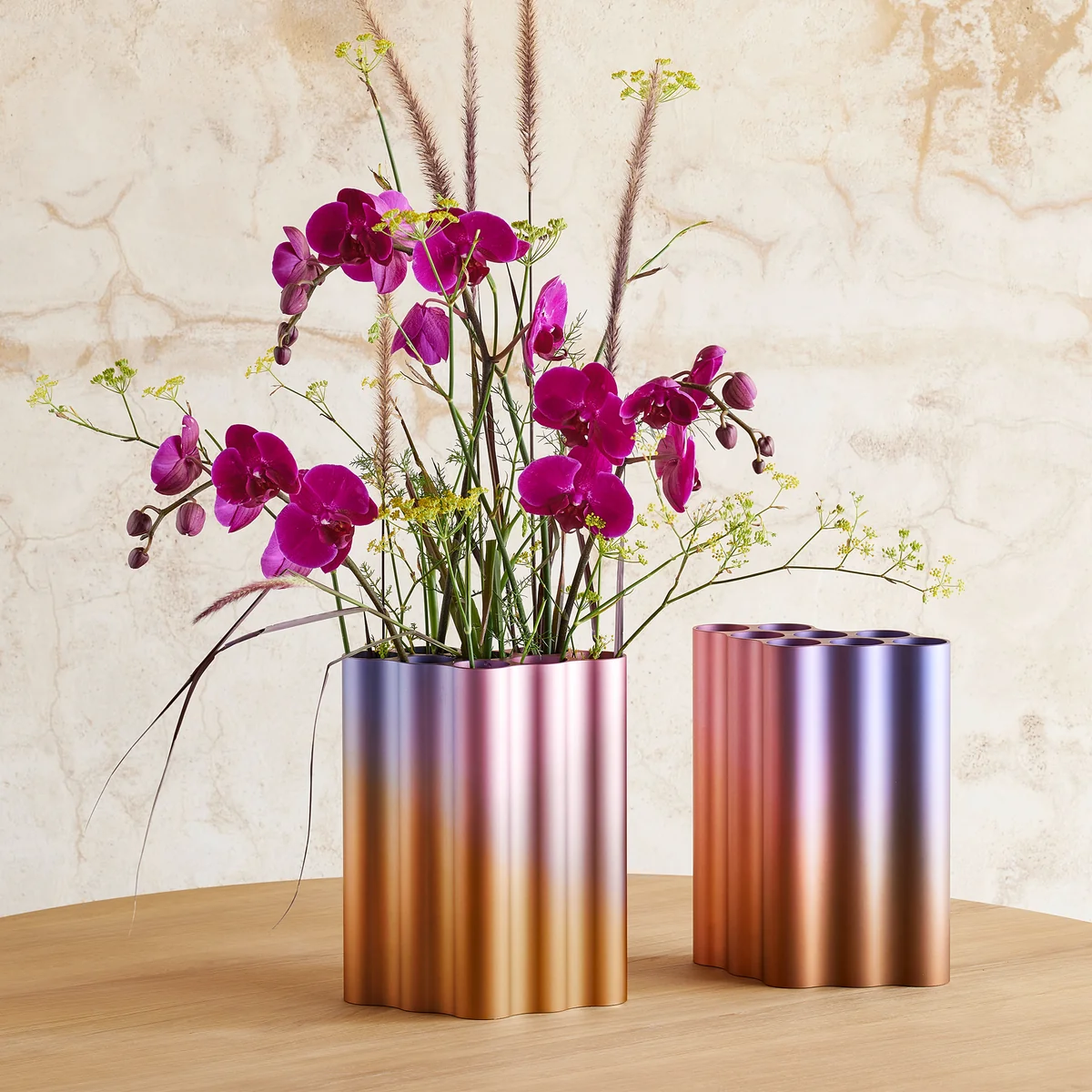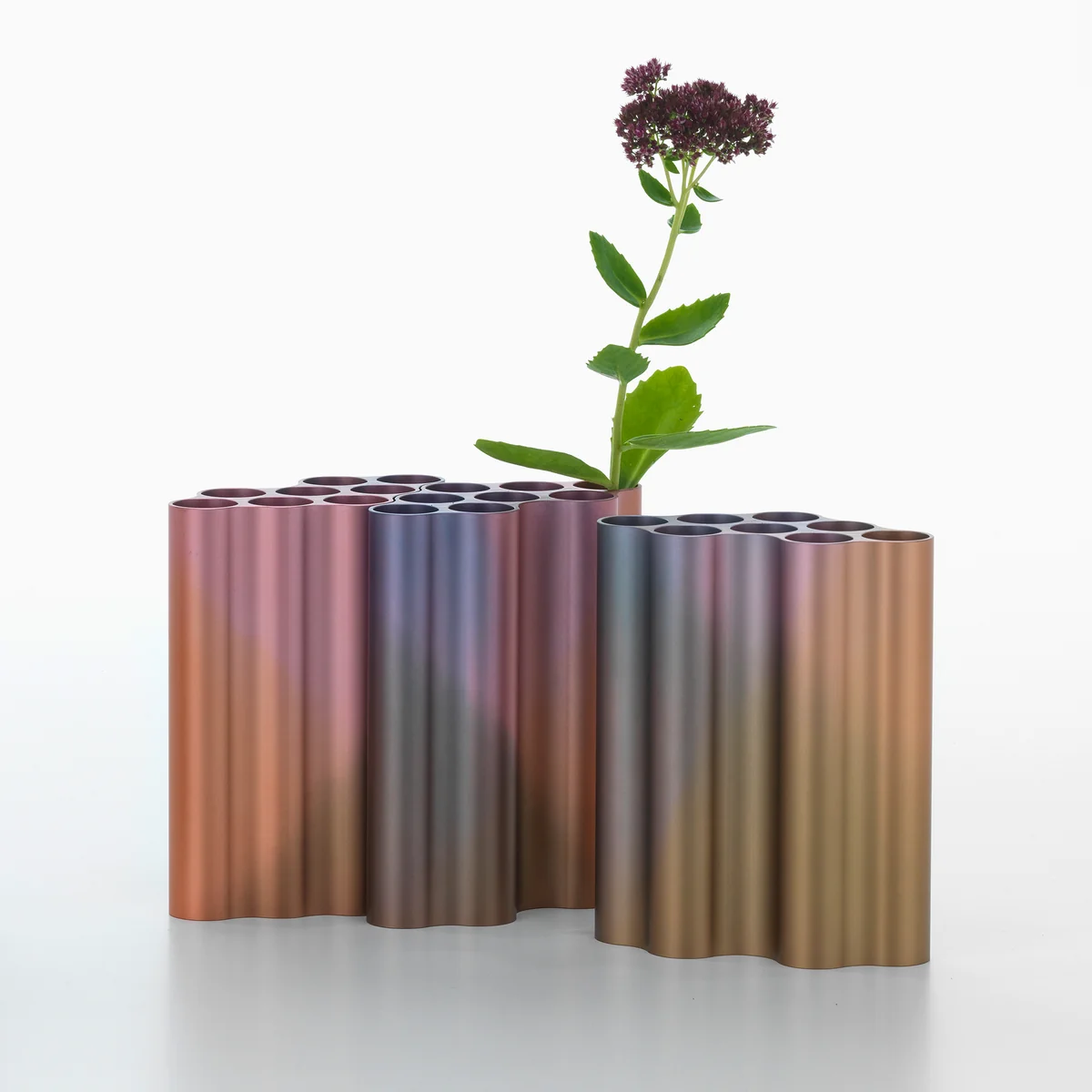 For the vase Nuage the designers draw the cloud shape from solid aluminum profiles in different lengths. The basic shape is now used upright, dividing the vase into eight individual tubes into which arrangements of flowers and grasses can be set. The colored anodized wavy surfaces create a delightful play of light and shadow.
