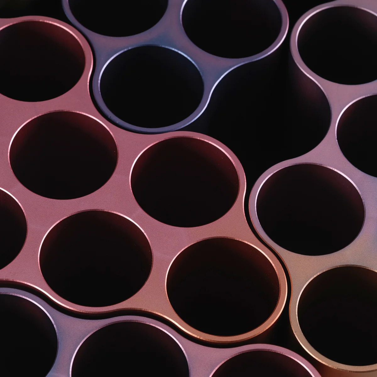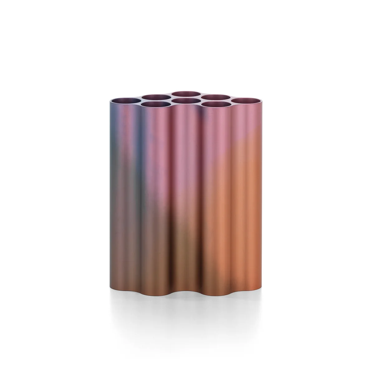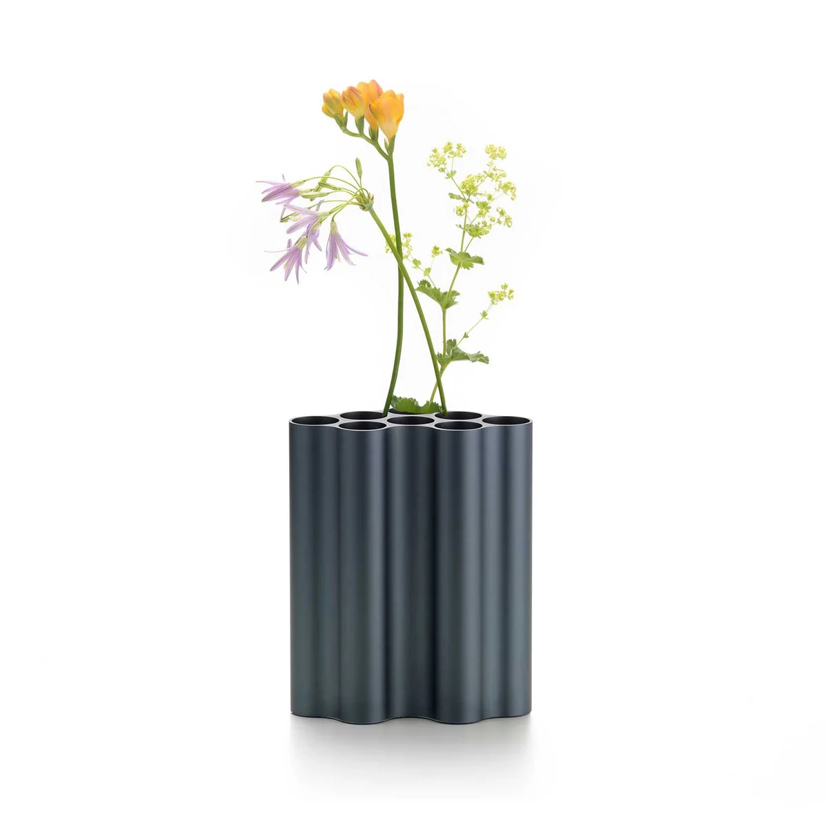 For the vase Nuage the designers draw the cloud shape from solid aluminum profiles in different lengths. The basic shape is now used upright, dividing the vase into eight individual tubes into which arrangements of flowers and grasses can be set. The colored anodized wavy surfaces create a delightful play of light and shadow.