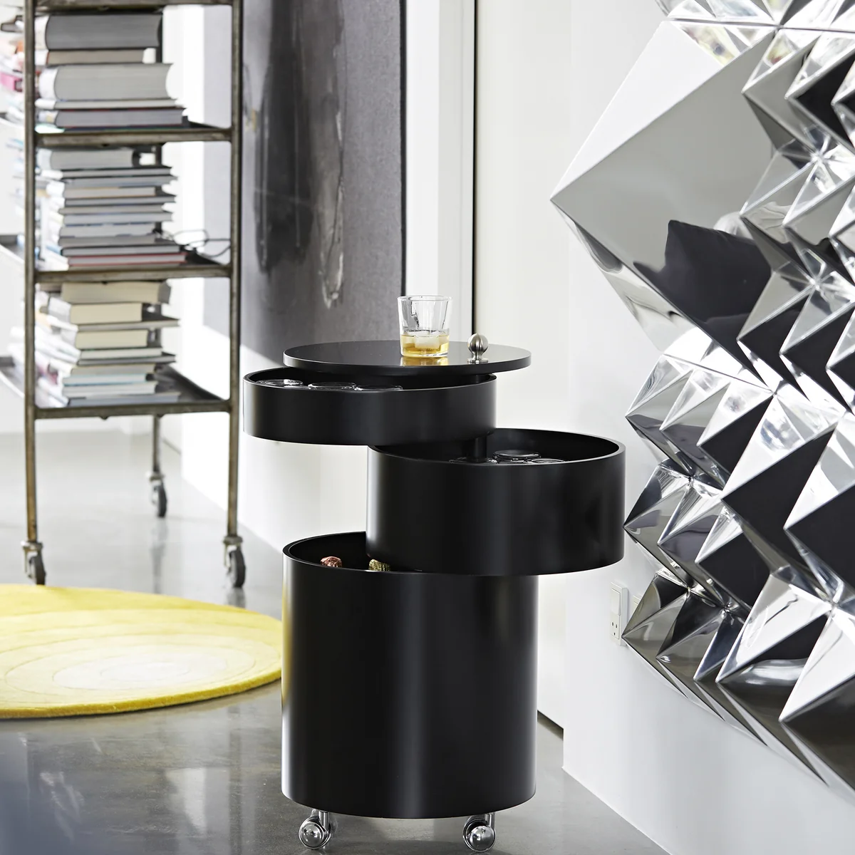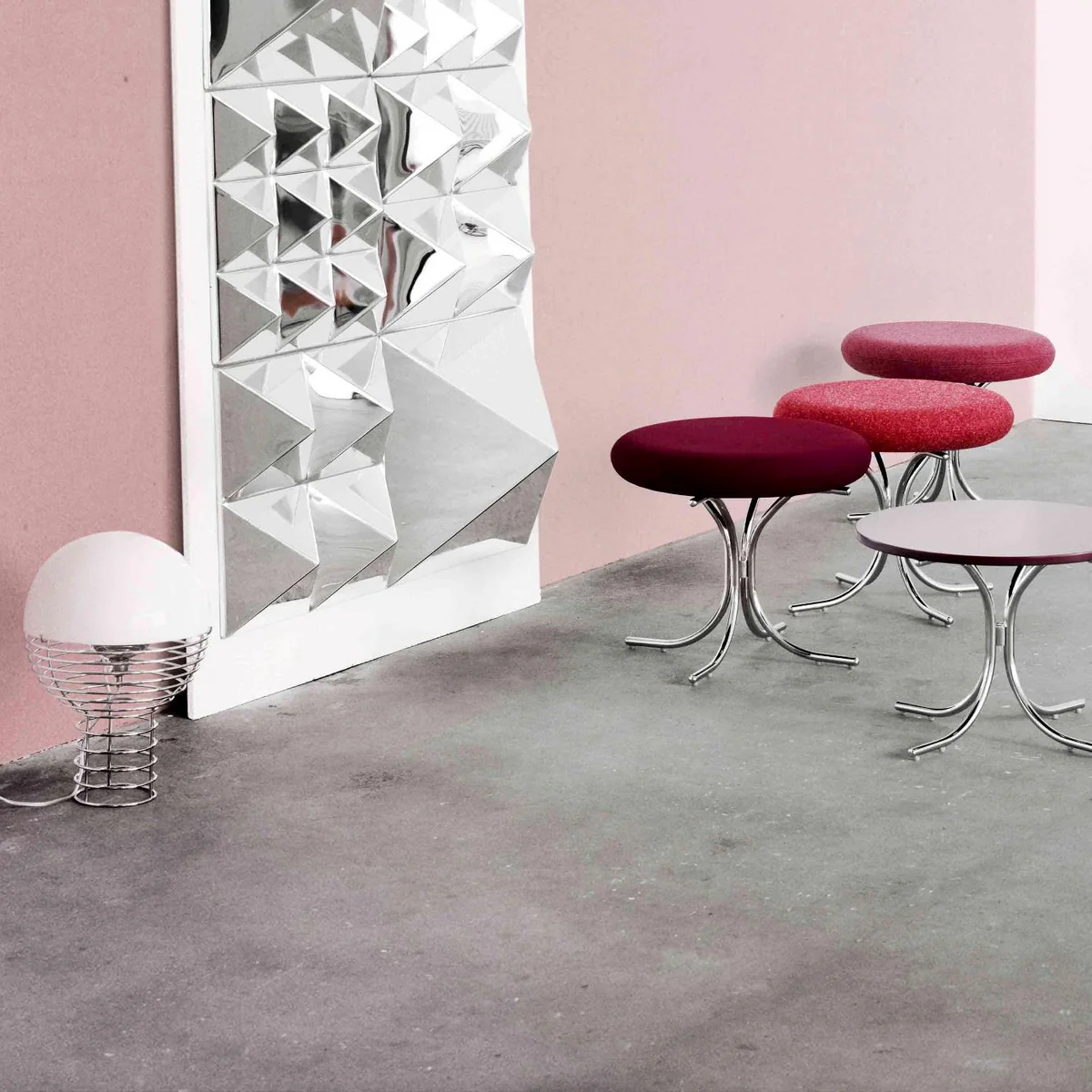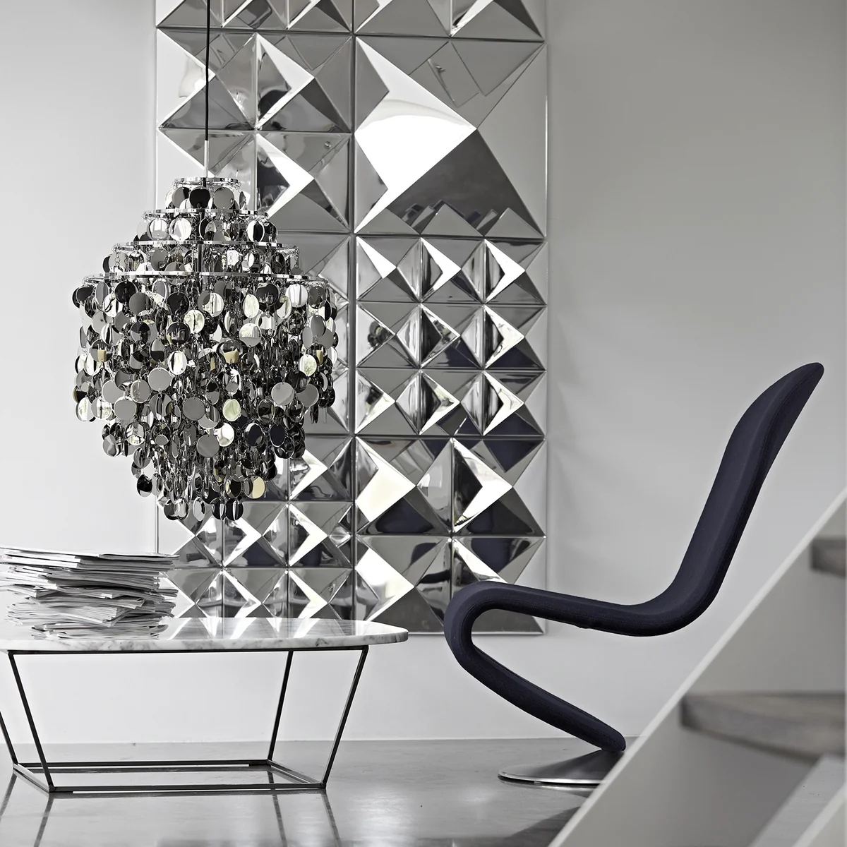 His sense of color, light, form and space set Verner Panton apart from the masses of designers. Panton often combined the design possibilities of individual elements and created impressive installations. This is what happened with the Mirror Sculptures, with which he tried to cancel out the conventional room design of ceiling, wall and floor and merge them into an inseparable spatial unit.