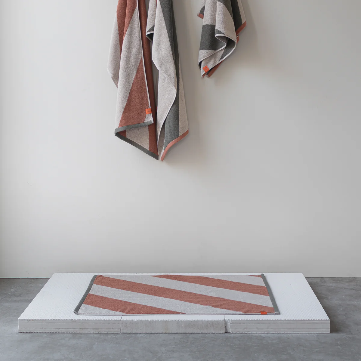 the Diagonal bath mat brings a fresh look to the bathroom with its diagonal stripes and harmonious color combinations. Made from certified organic cotton (OEKO-TEX® 100), the mat offers a soft and non-slip surface. The decorative orange loop makes it easy to hang up and dry between uses.