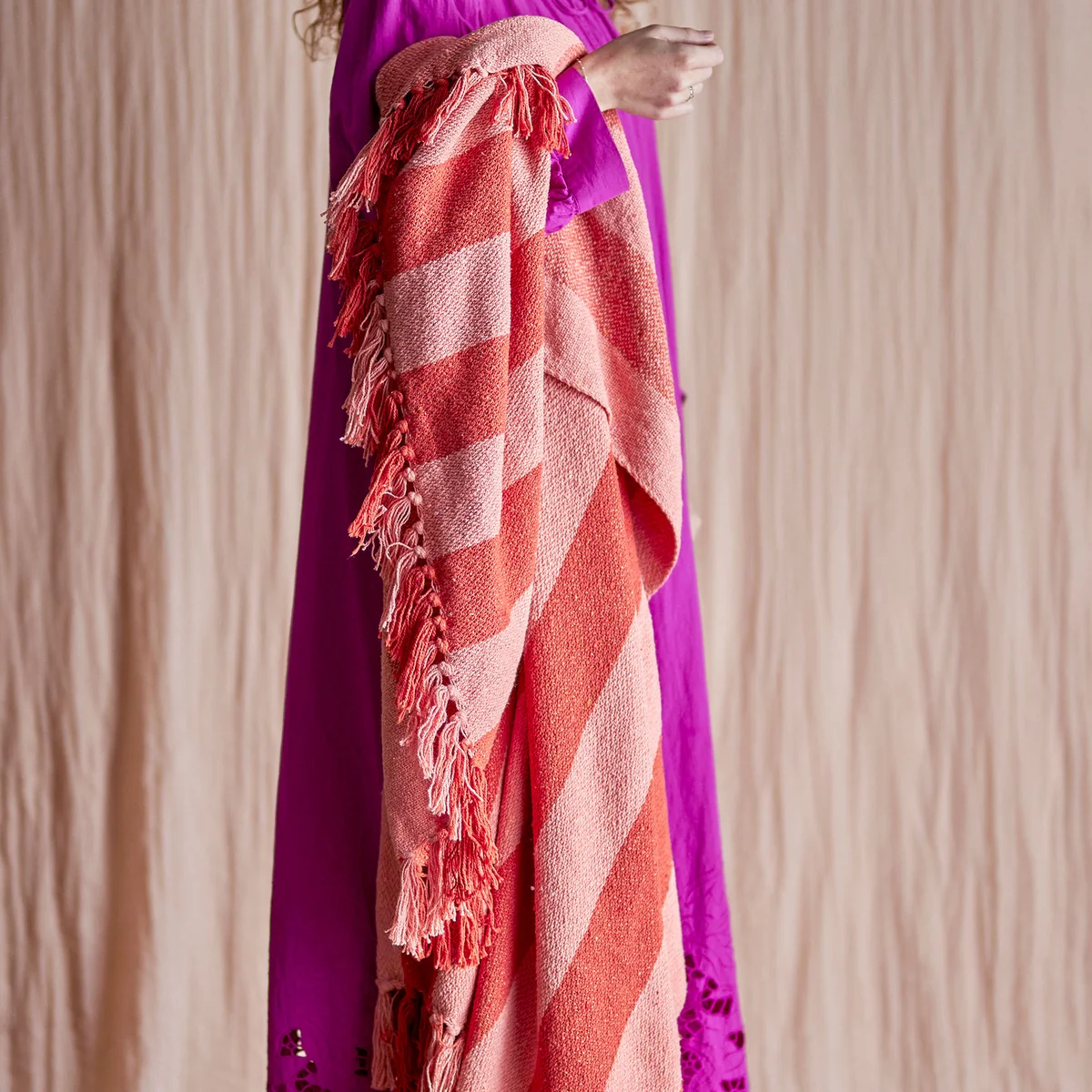 The Frello blanket impresses with its woven pattern in warm red tones and a particularly soft texture. Made from recycled cotton, it combines sustainable materials with stylish coziness. Fine fringes along the edges give the blanket an elegant touch, while it provides cozy warmth on cold days - perfect for snuggling up on the sofa or in your favourite armchair.