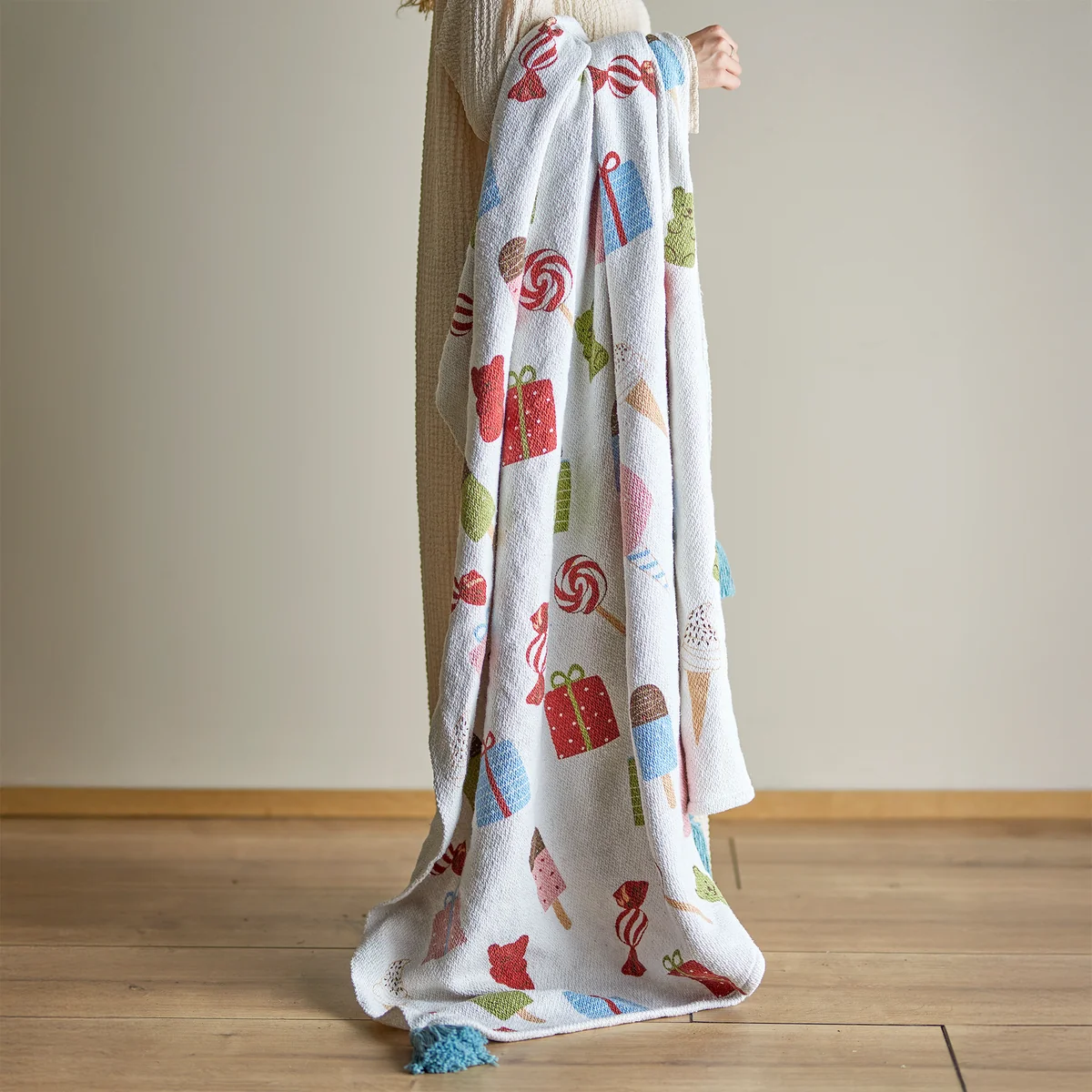 The Sweets blanket from Bloomingville Mini is a festive eye-catcher in the nursery. Made from recycled cotton, this cuddly blanket combines sustainable comfort with a playful design that will make children's hearts beat faster. Lovingly designed illustrations of presents, sweets and ice cream conjure up a summery atmosphere and invite children to embark on imaginative adventures. Decorative tassels at each corner add a charming accent to the blanket and round off the cheerful overall look. Whether as a warming cuddly blanket or as an atmospheric decorative element - the Sweets blanket creates a cheerful and inviting atmosphere in any nursery.