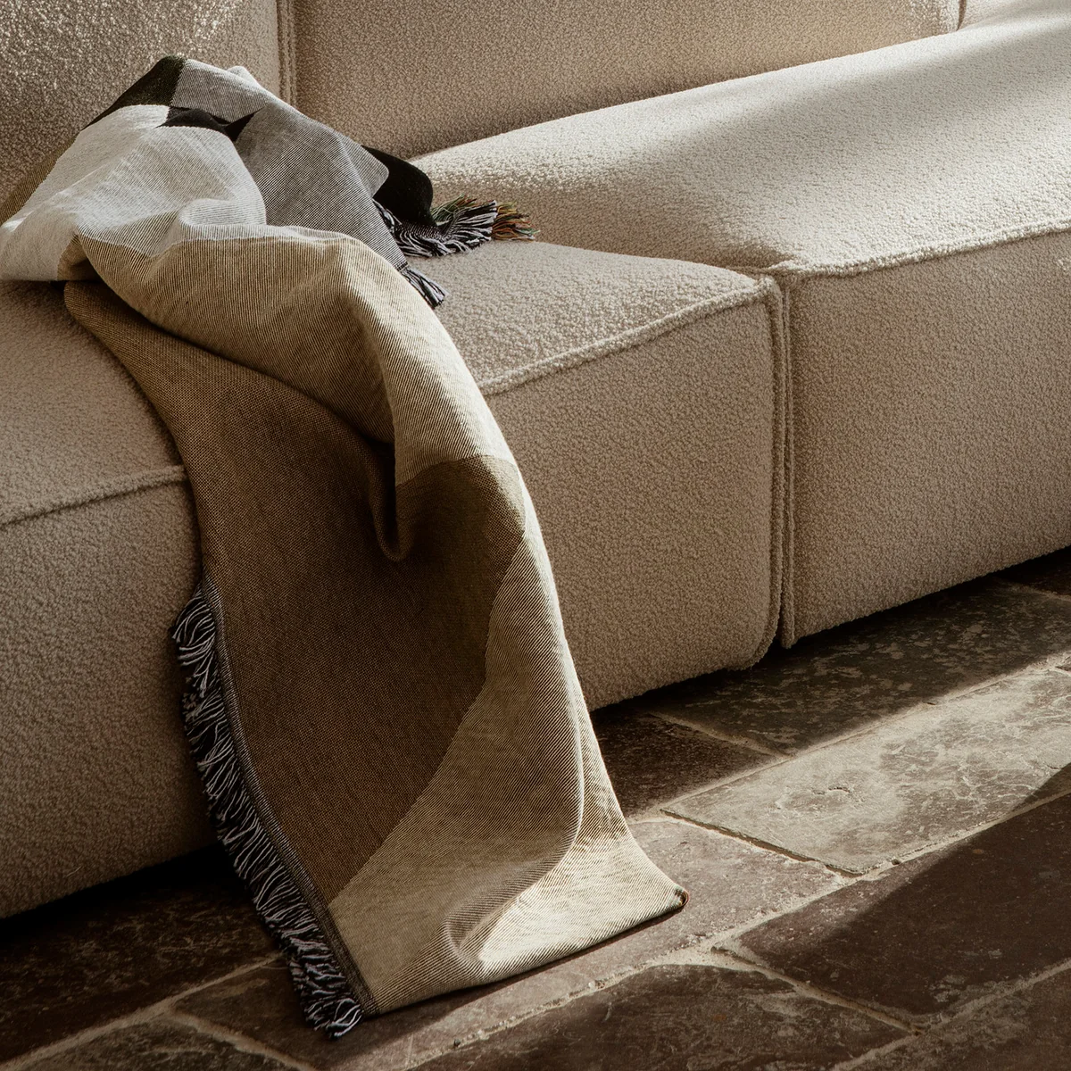The soft, distinctive color scheme balances the distinctive artwork and combines with the modern and abstract print, making it a wholesome visual experience. The Entire Blanket from Ferm Living is made using the classic tapestry technique and features decorative fringing around the edges.
