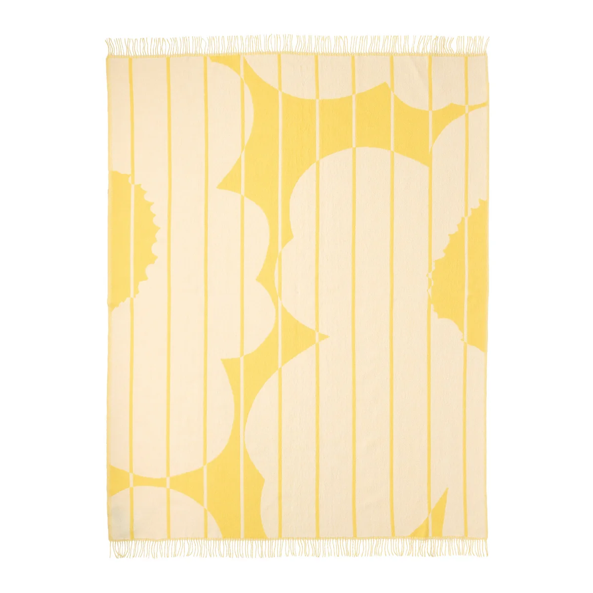 The Vesi Unikko wool blanket from Marimekko is made using the jacquard knitting technique and decorated with fringes at the ends. The colors of the pattern are inverted on the reverse. This product commemorates the 60th anniversary of the Unikko pattern and proudly bears the anniversary label.
