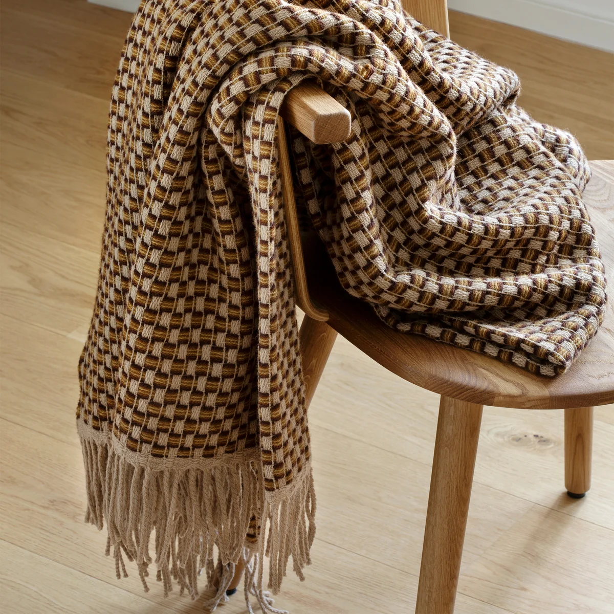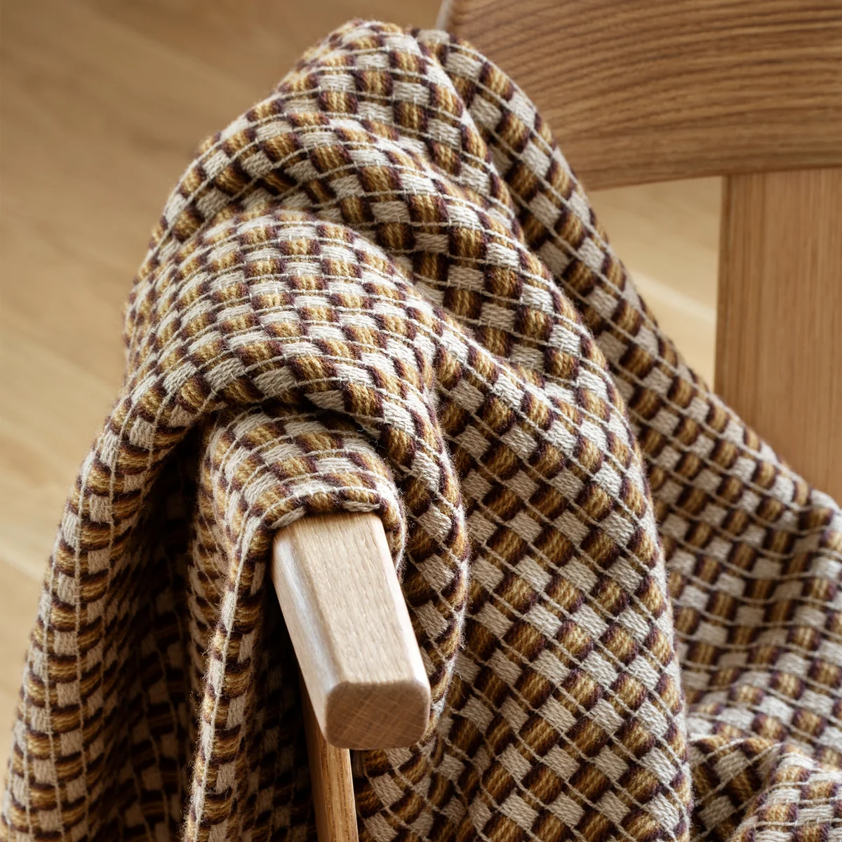 The Isak Wool blanket from the Norwegian manufacturer Røros Tweed reminds with its braided look of seats of classic Shaker chairs. The pattern of the Isak blanket by designers Anderssen & Voll was created in 2016 and was part of the research project "Furnishing Uptopia." The venue for the workshop was the Hancock Shaker Village in the USA, which served as a source of inspiration with its iconic Shaker chairs. The design studio's goal was to implement the look of the colorful woven cotton ribbons of the classic chairs within a decorative blanket.
