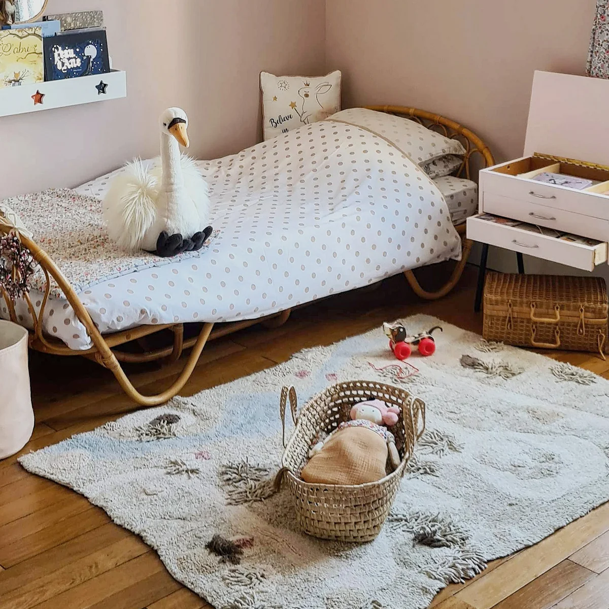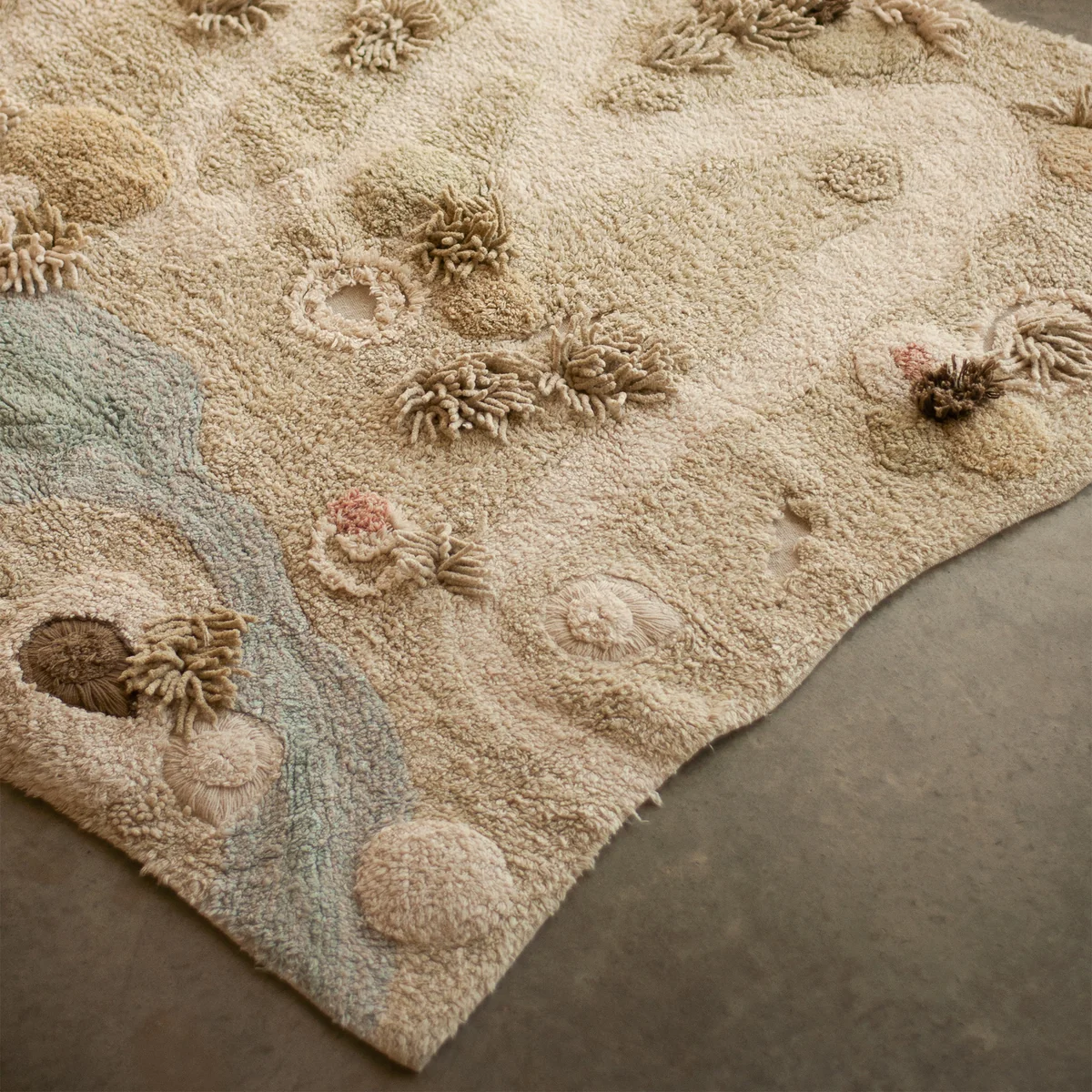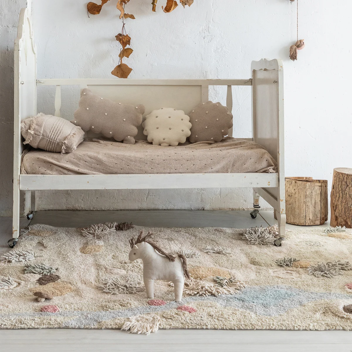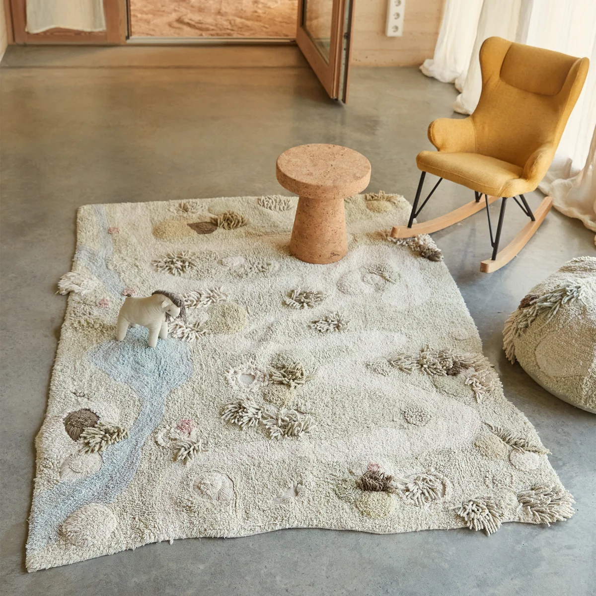 The Path of Nature Play Carpet from the house Lorena Canals offers playful learning processes in the Mediterranean forest. The smallest family members can let their imagination run wild and can wonderfully explore the paths and structures of the forest on the small plush horse. The carpet can be wonderfully placed and transported throughout the house. Path of Nature Is made from a cotton base with recycled textile fibers.