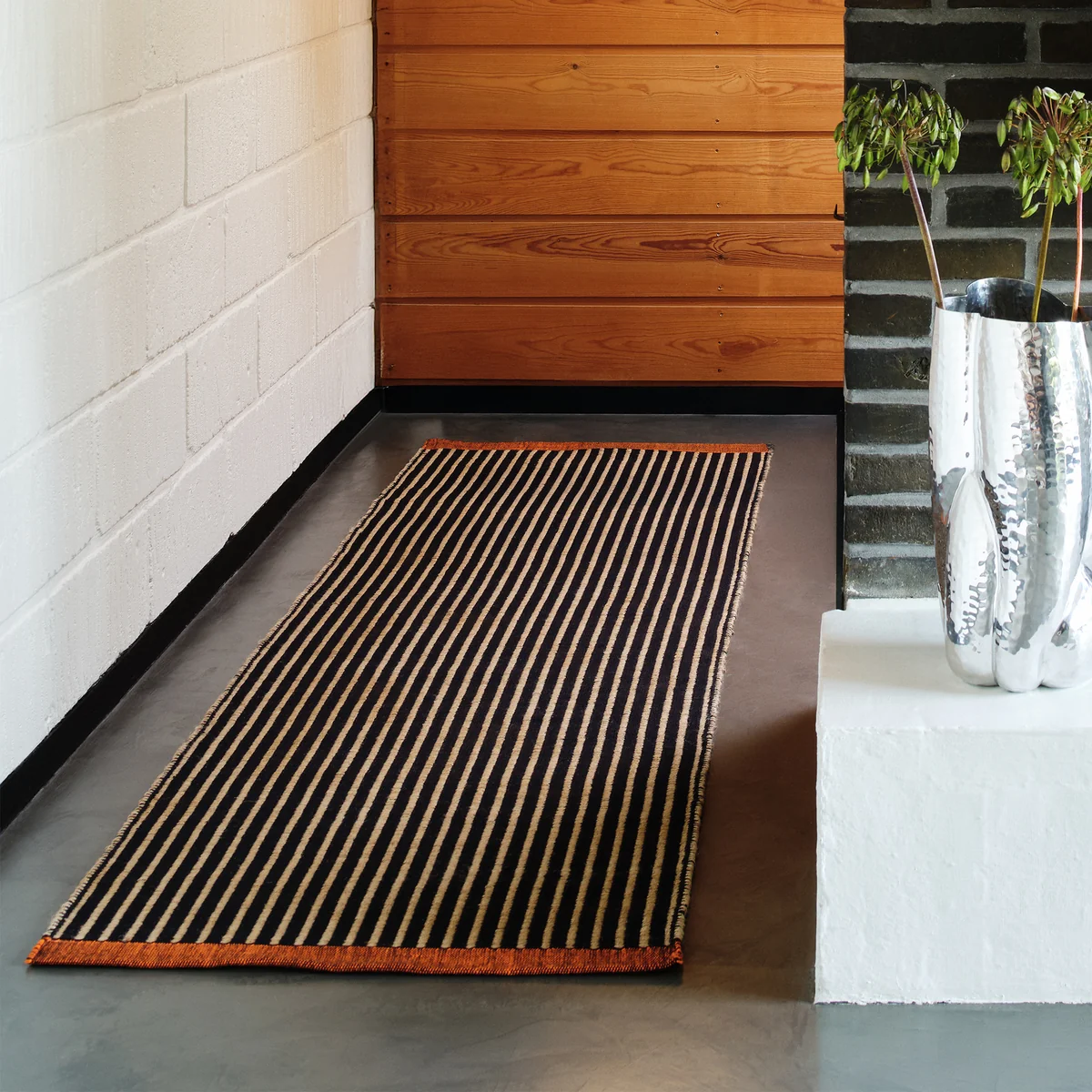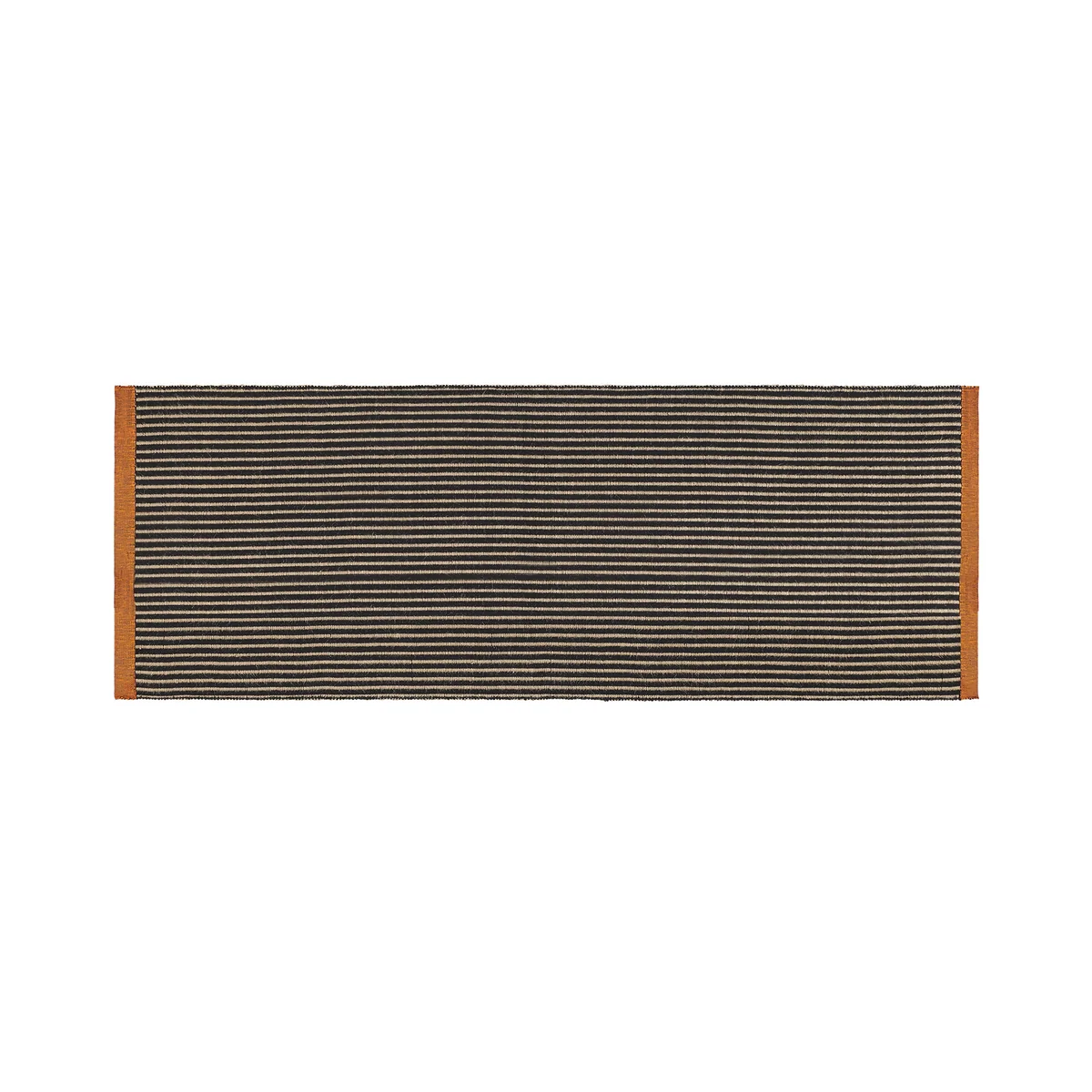 The Line carpet runner combines functional design with precision craftsmanship. Made from a natural jute blend using a flat weaving technique that can be used on both sides, the rug impresses with its striking lines. The orange woven band provides a targeted color accent, while the black stripes give the design a dynamic structure. Available in three different sizes, the rug blends flexibly into different room concepts - from a subtle accent to an expressive focal point.