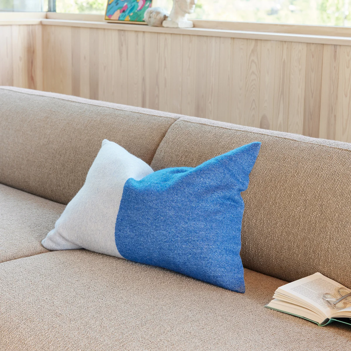 The cushion is woven from high-quality merino wool, which captures the essence of these fleeting, everyday moments in its composition. It is inspired by the ever-changing shades of the sky and the sea.