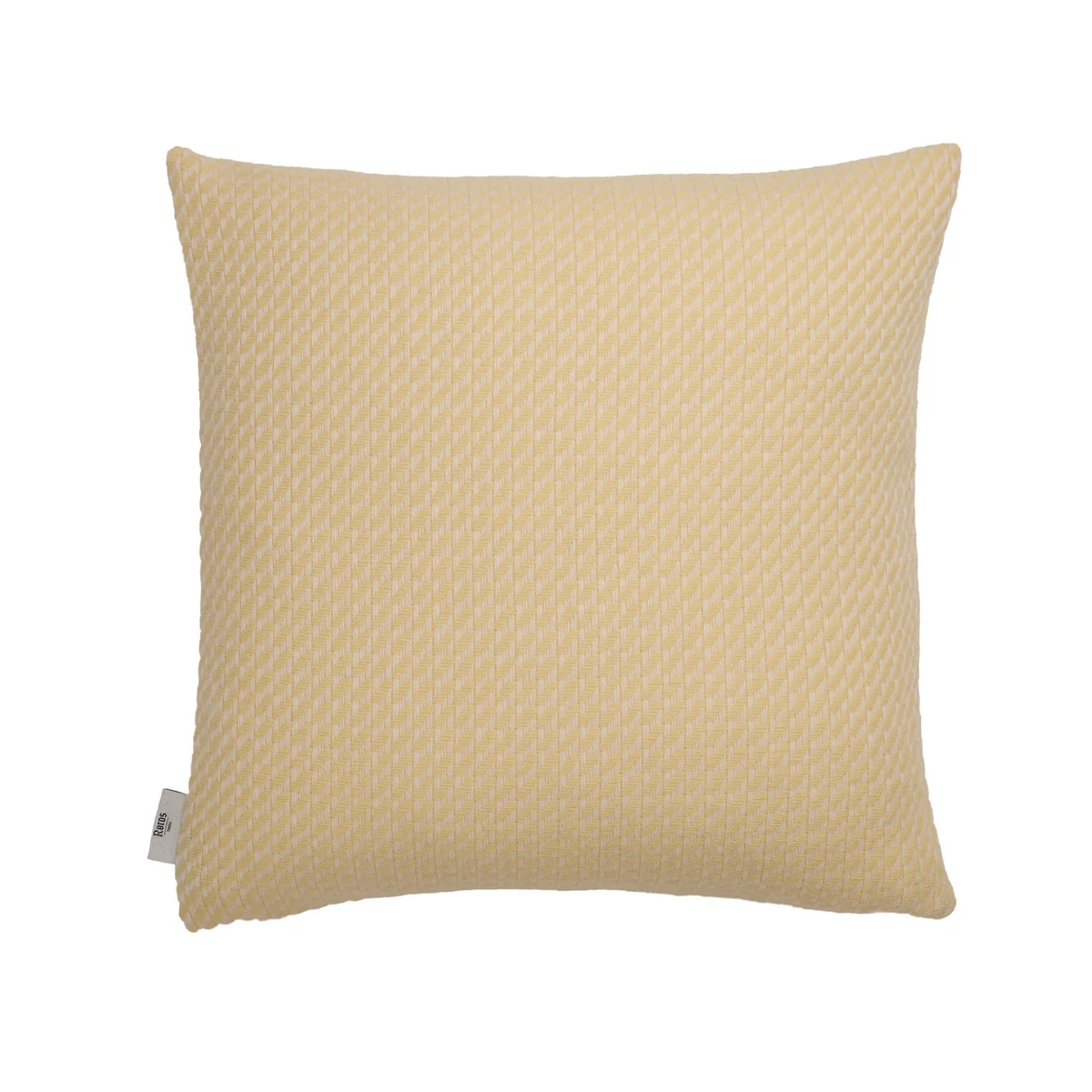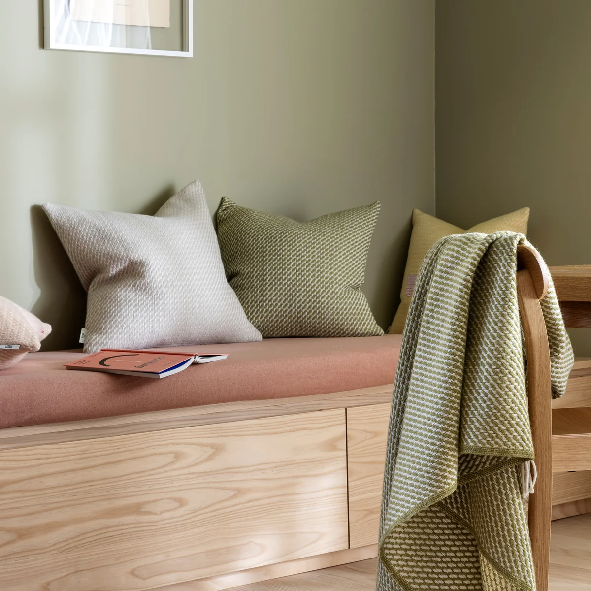 The Mello cushion by Skogstad & Wærnes for Røros Tweed. The design introduced last season Mello -design introduced last season is now being extended with a range of cushions available in the same colors as the existing throws. Skogstad & Wærnes experimented with yarn and paper to create a diagonal pattern. The result is a structurally resilient construction that gives the fabric a three-dimensional texture.