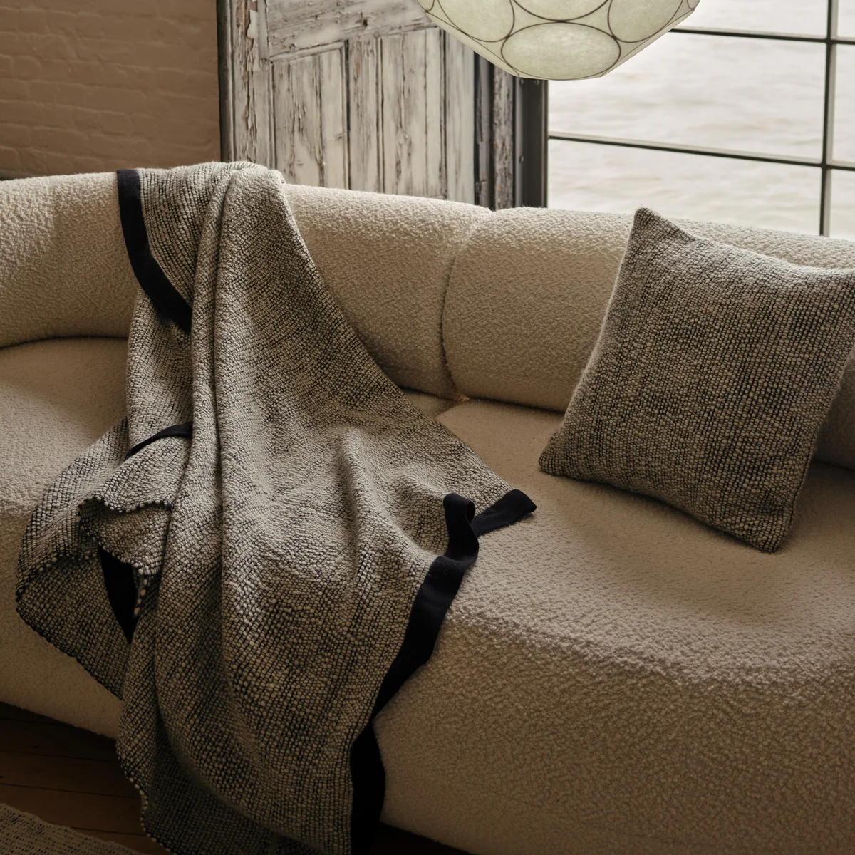 The Thread cushion is characterized by its distinctive texture and high-quality craftsmanship. The visible weft and warp threads give the cushion a lively structure, while the wool blend ensures a pleasantly soft feel. Each cushion is hand-woven by skilled craftsmen and brings a subtle blend of comfort and design to living and lounge areas.