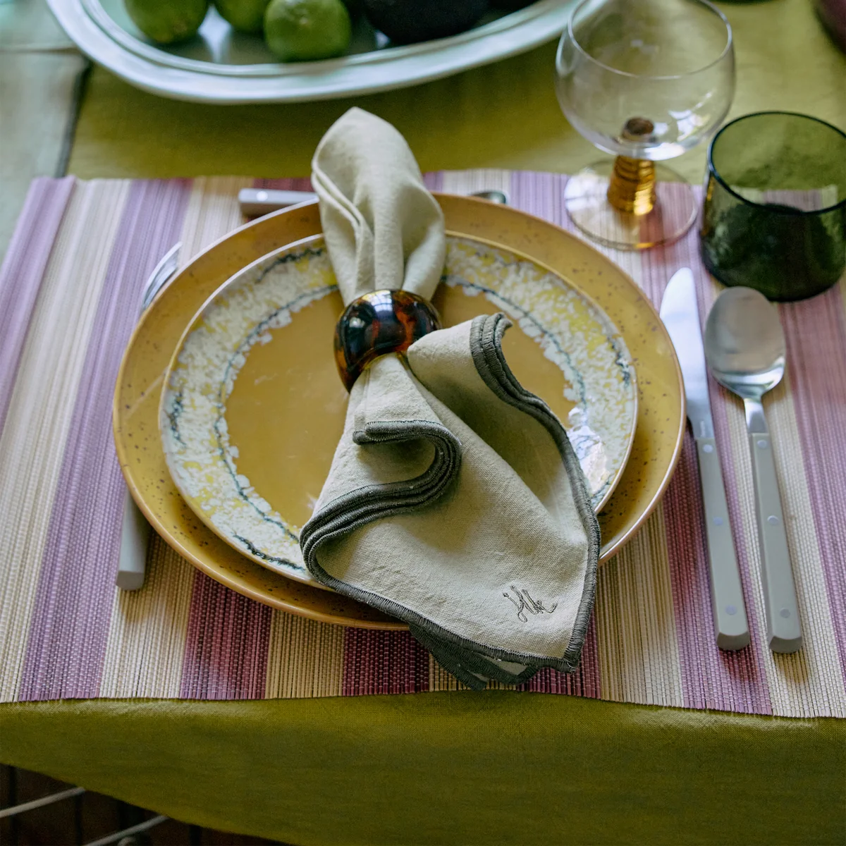The Ease napkins from HKliving are made from a fine material mix of 60% linen and 40% cotton. They give the table setting a refined, natural look and complement the dining table both in everyday life and on special occasions. Subtle HK embroidery adds a stylish detail and refers to the artistic inspiration of the collection.