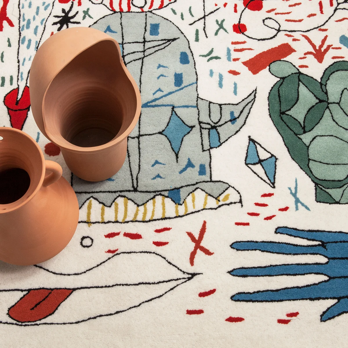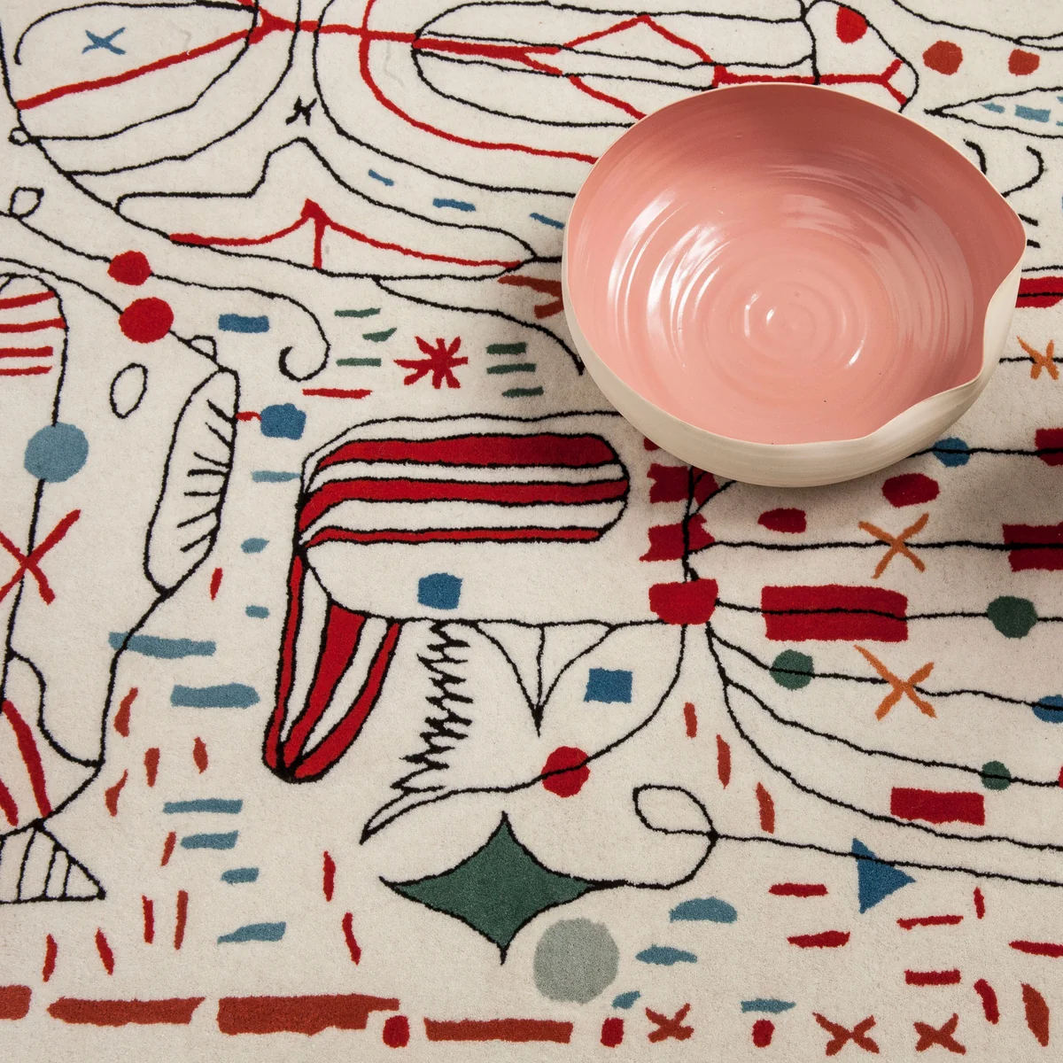 Based on the drawings by designer Jamie Hayon, the hand-tufted rugs feature a number of different motifs. The wool elements are supplemented manually with a rug gun, to achieve the intuitive and fluid lines and an organic composition.