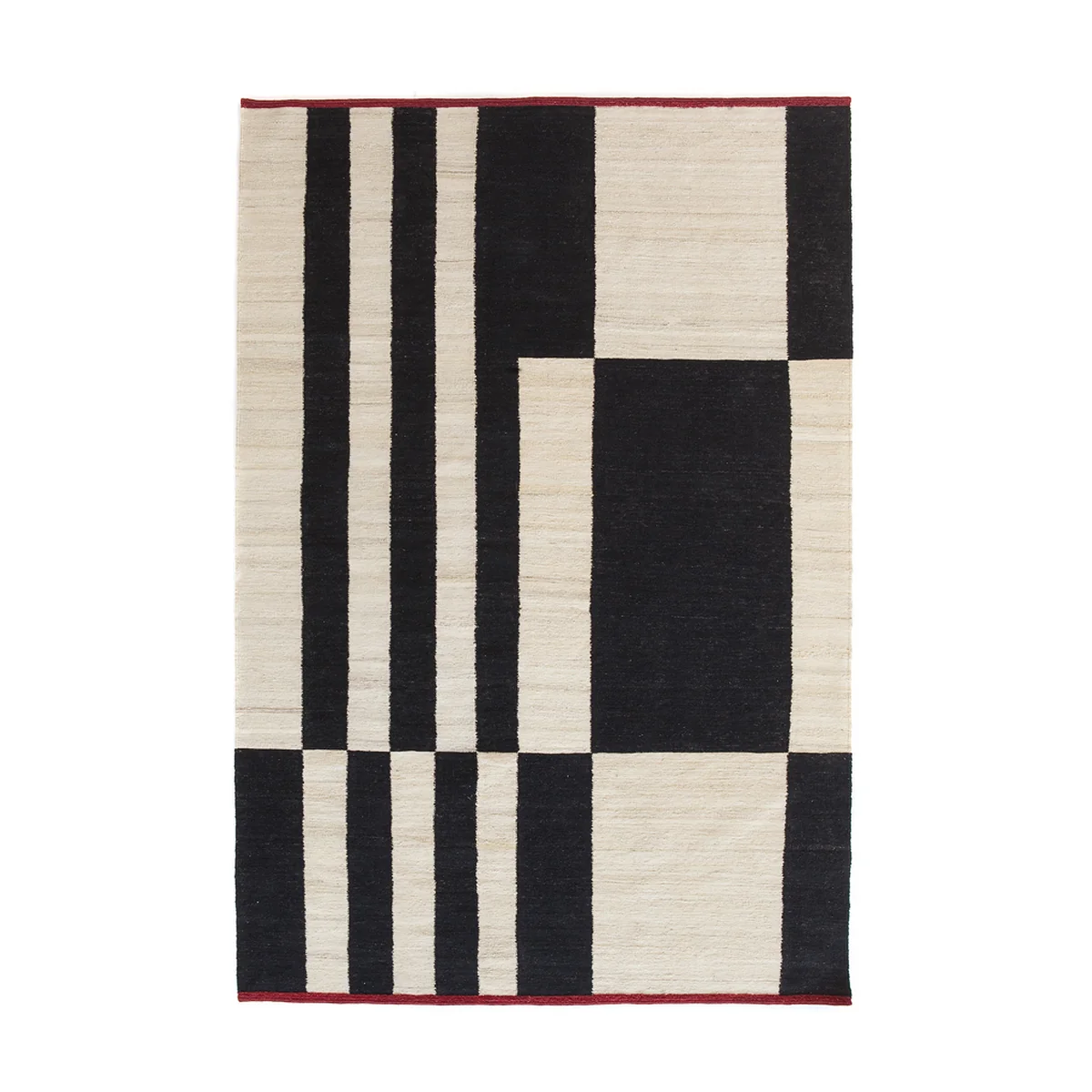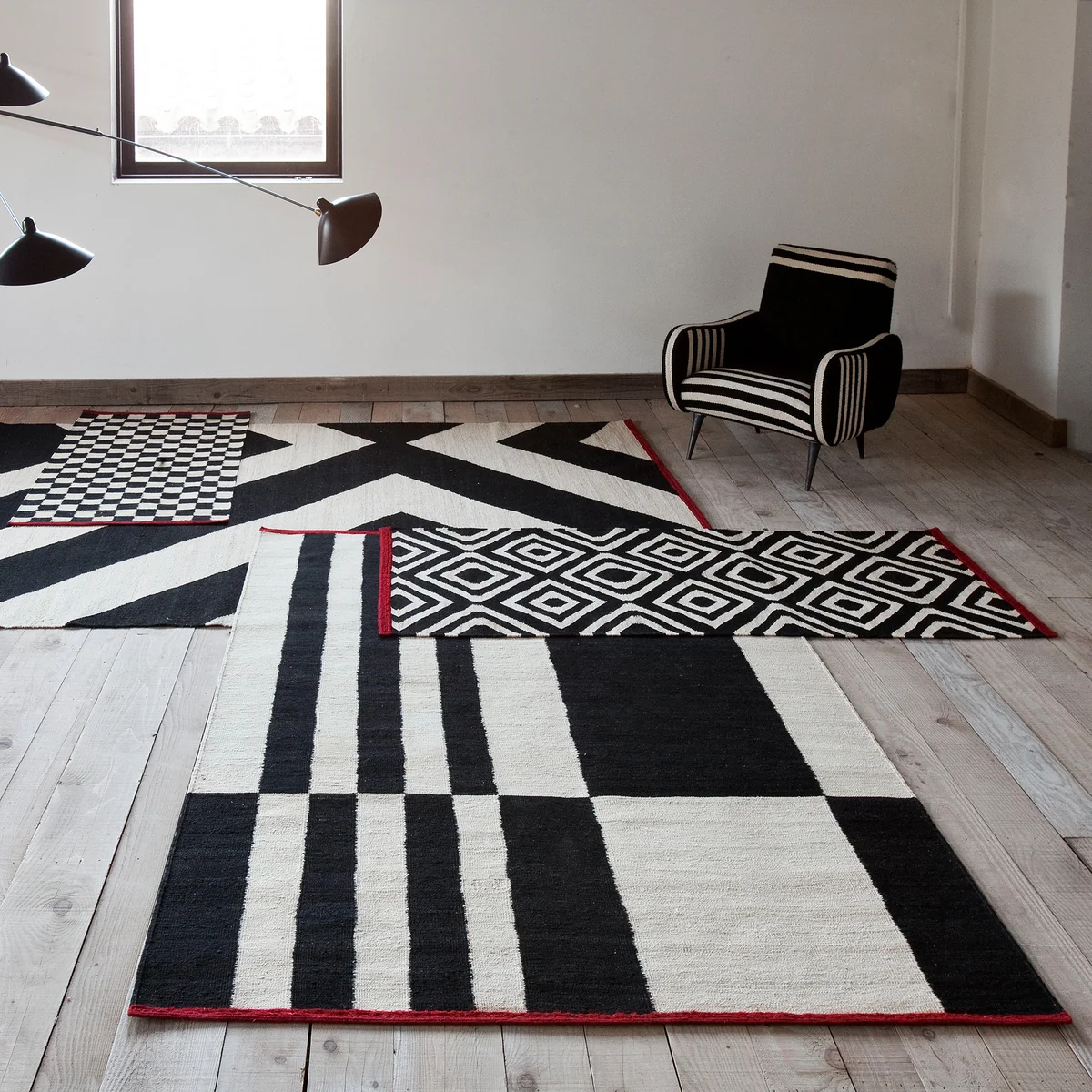 Available in different sizes, the Stripes rug is adorned with a graphic pattern that is complemented by red piping on the edge of the rug.