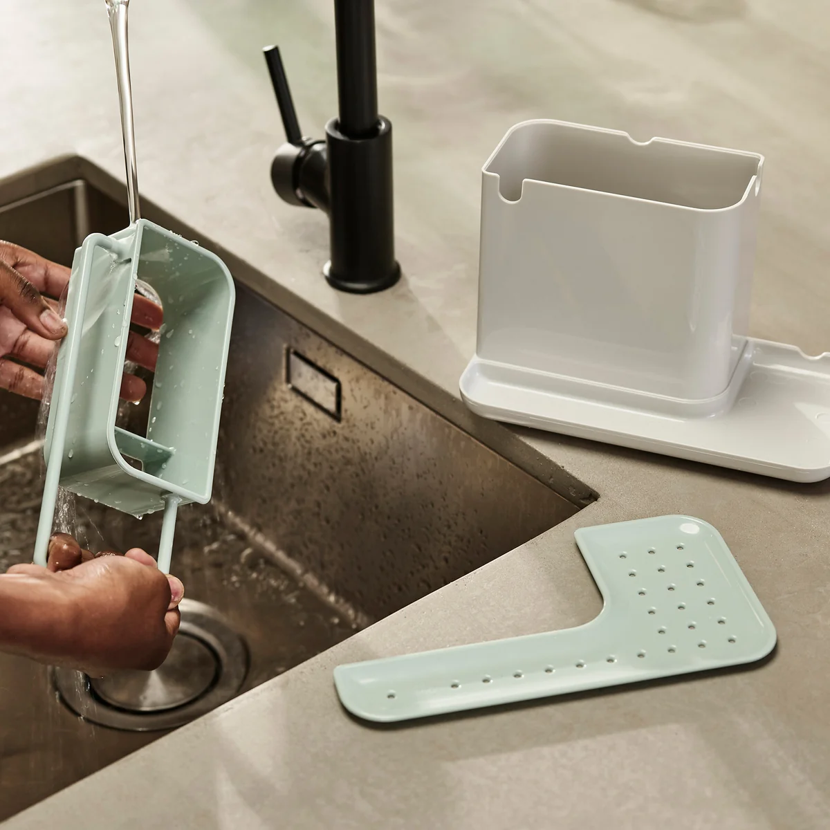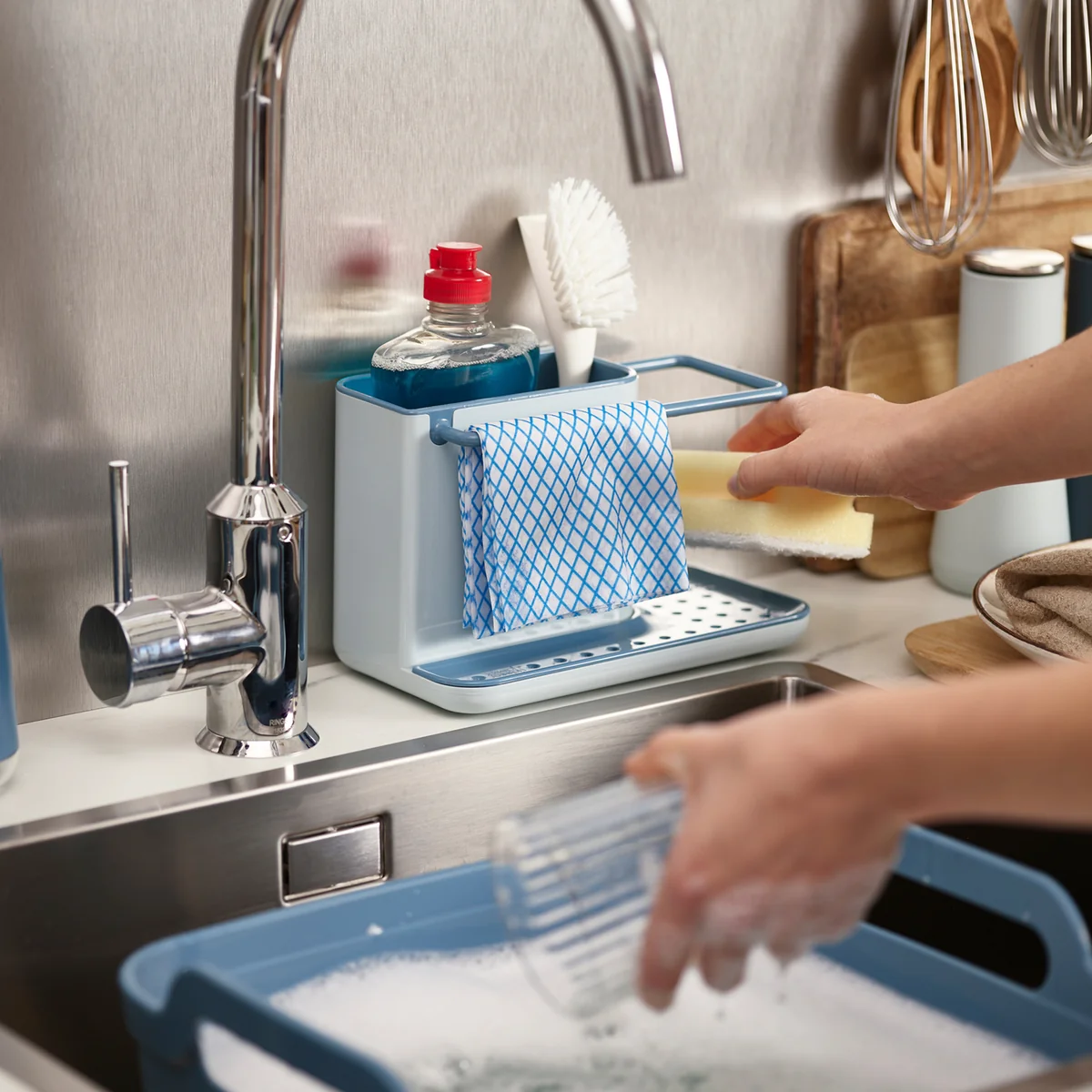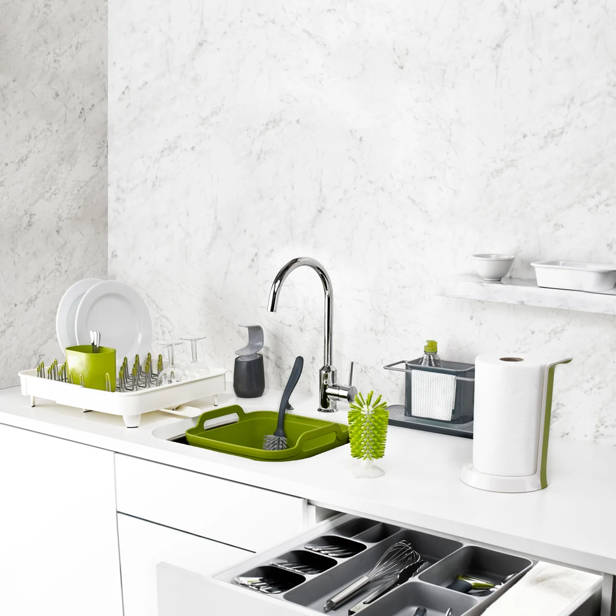 Tidiness is the half life. With the kitchen helpers, Joseph Joseph ensures that to keep things clean is not hard. Since Caddy connects several functions. The main part offers a lot of space for brushes and rinsing products. Humid cloths can be hanged at the bar.