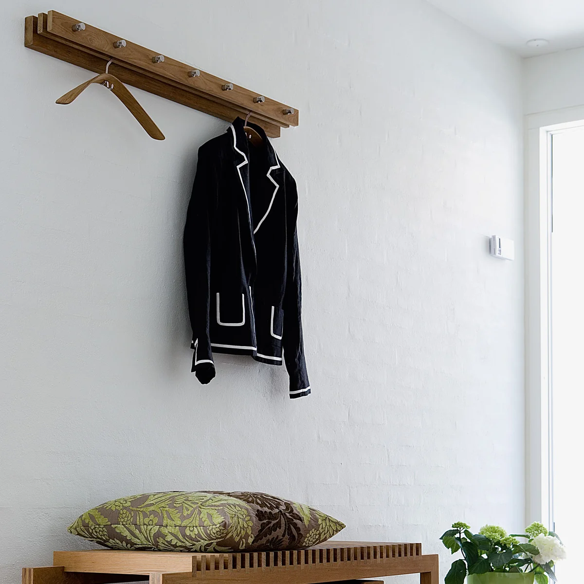 The Pilot hanger by designer Nina Tolstrup is available in teak and oak. Not least because of the material the Pilot Coat hanger is an optimal complement to the Cutter wardrobe series by Skagerak.