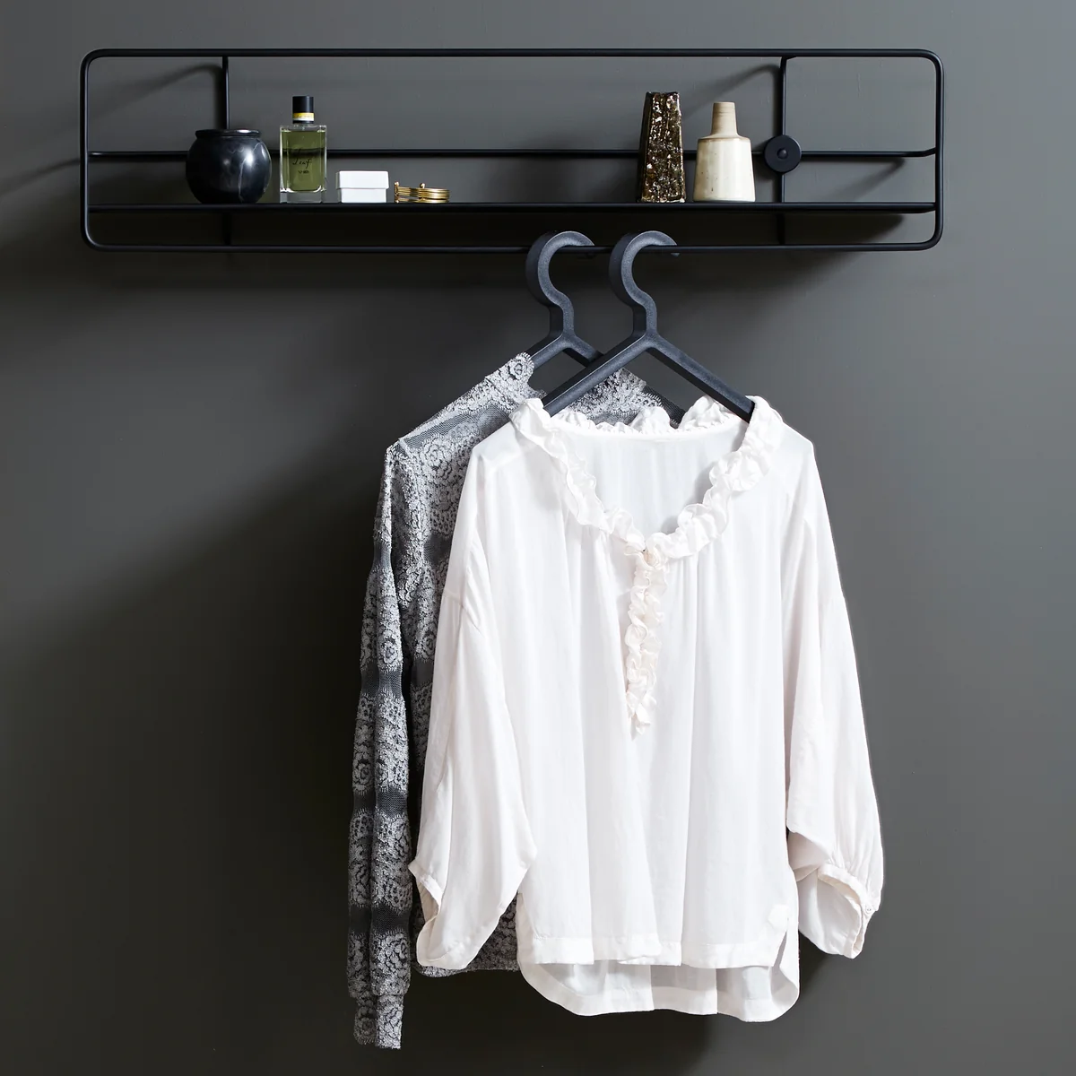 The Illusion Hanger by Woud plays with perception and challenges the eye. The proportions and the shape of the clothes hanger are hard to perceive at first glance, only when hanging on the clothes rail it can be seen. Only when hanging, it slowly swings in a diagonal position, which both presents the hanging clothes well and takes up little space on the rail.