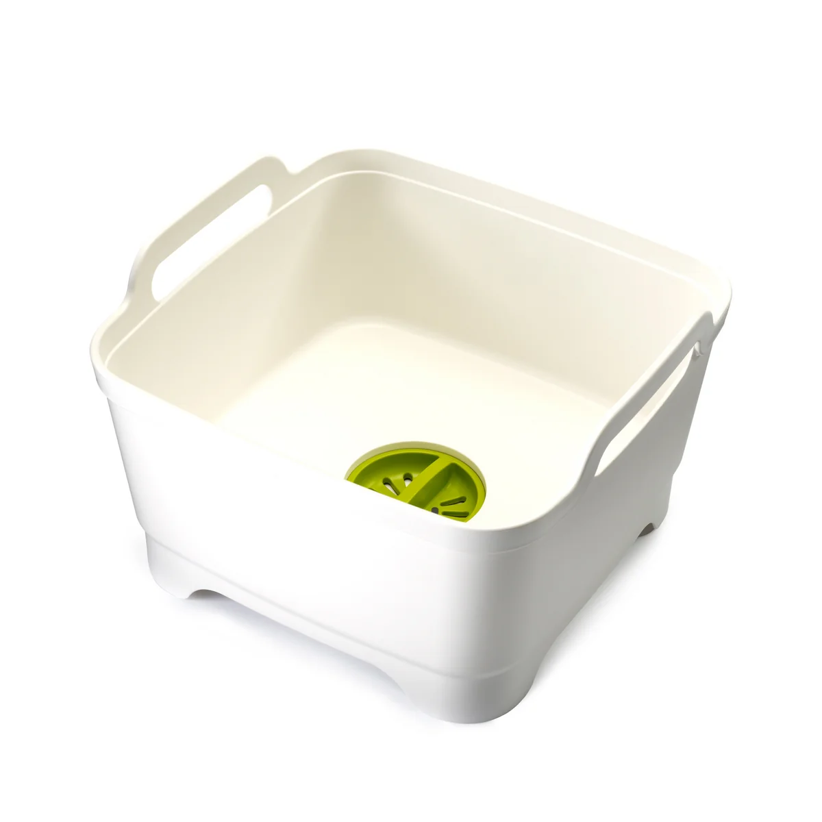 The steep walls of the Wash&Drain Dishwashing bowl make sure that the water stays where it belongs - inside of the bowl - whereas the large carrying handles comfort the transport of the bowl. These advantages highlight that the Wash&Drain, Dishwashing bowl with straining plug by Joseph Joseph is perfectly suitable for using it at every place.