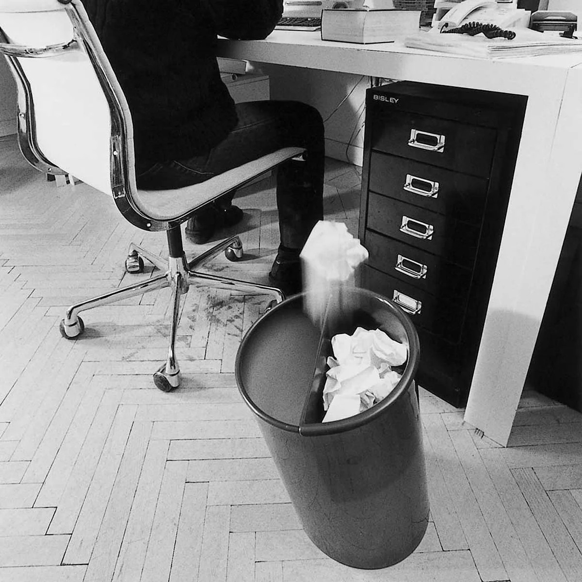 The leaning waste-paper basket "in Attesa" is one of Enzo Mari's design classics. It is an outstanding, timeless article of daily use which should not be missing in any tasteful office.